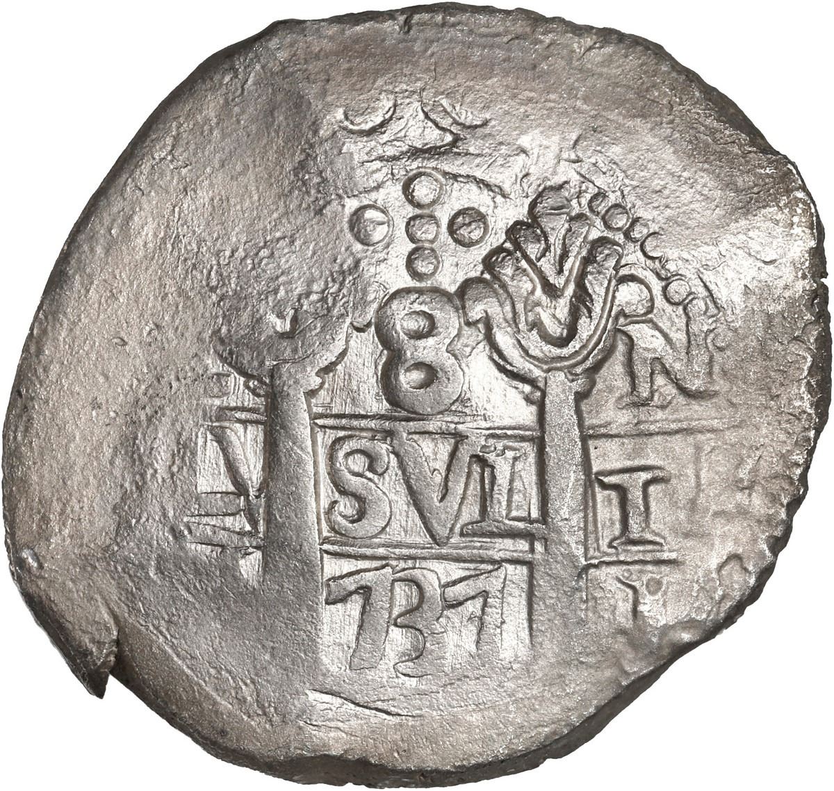 PERU, Lima, cob 8 reales, 1737/6 N, unique(?). S-L21; KM-unl (34a for type); Cal-unl (Type 162). 24.93 grams. Oblong flan, frosty UNC with traces of peripheral porosity, full but off-center cross, good full pillars with clear date exhibiting a clear 7/6 overdate, the first example we have ever seen or heard of.