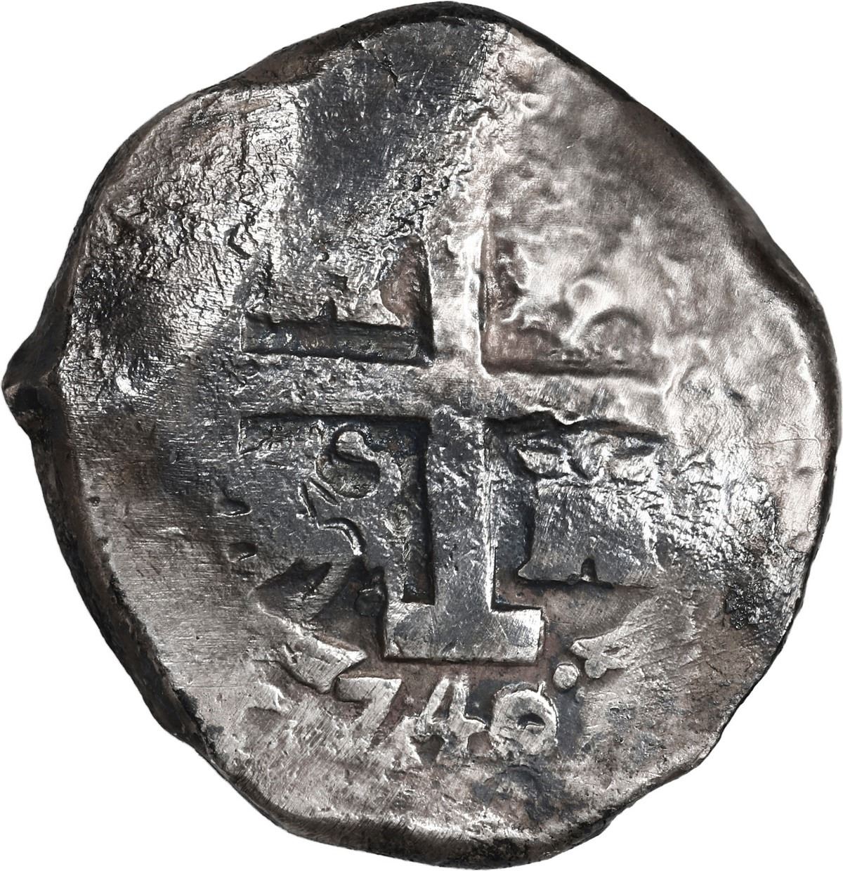 PERU, Lima, cob 8 reales, 1740/39 V, ex-Ugaz. S-L22; KM-34a; Cal-1316. 25.90 grams. Thick flan with bold centers (nearly full pillars and cross) including two dates showing clear 0/9, VF with some surface oxidation and patchy toning. Pedigreed to the Jorge Ugaz Collection.