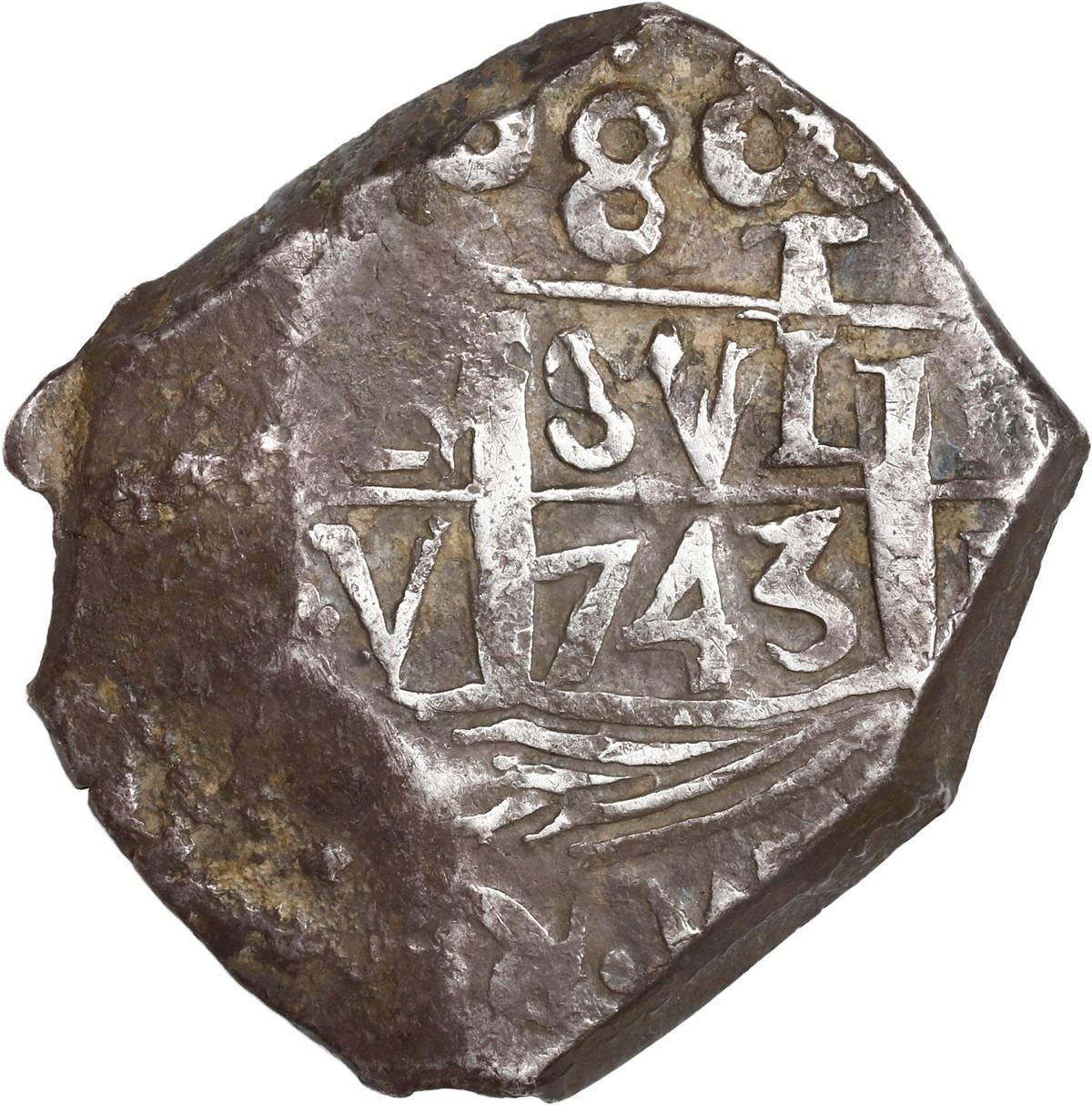 PERU, Lima, cob 8 reales, 1743 V, cross-of-five-dots at top, ex-Ugaz.