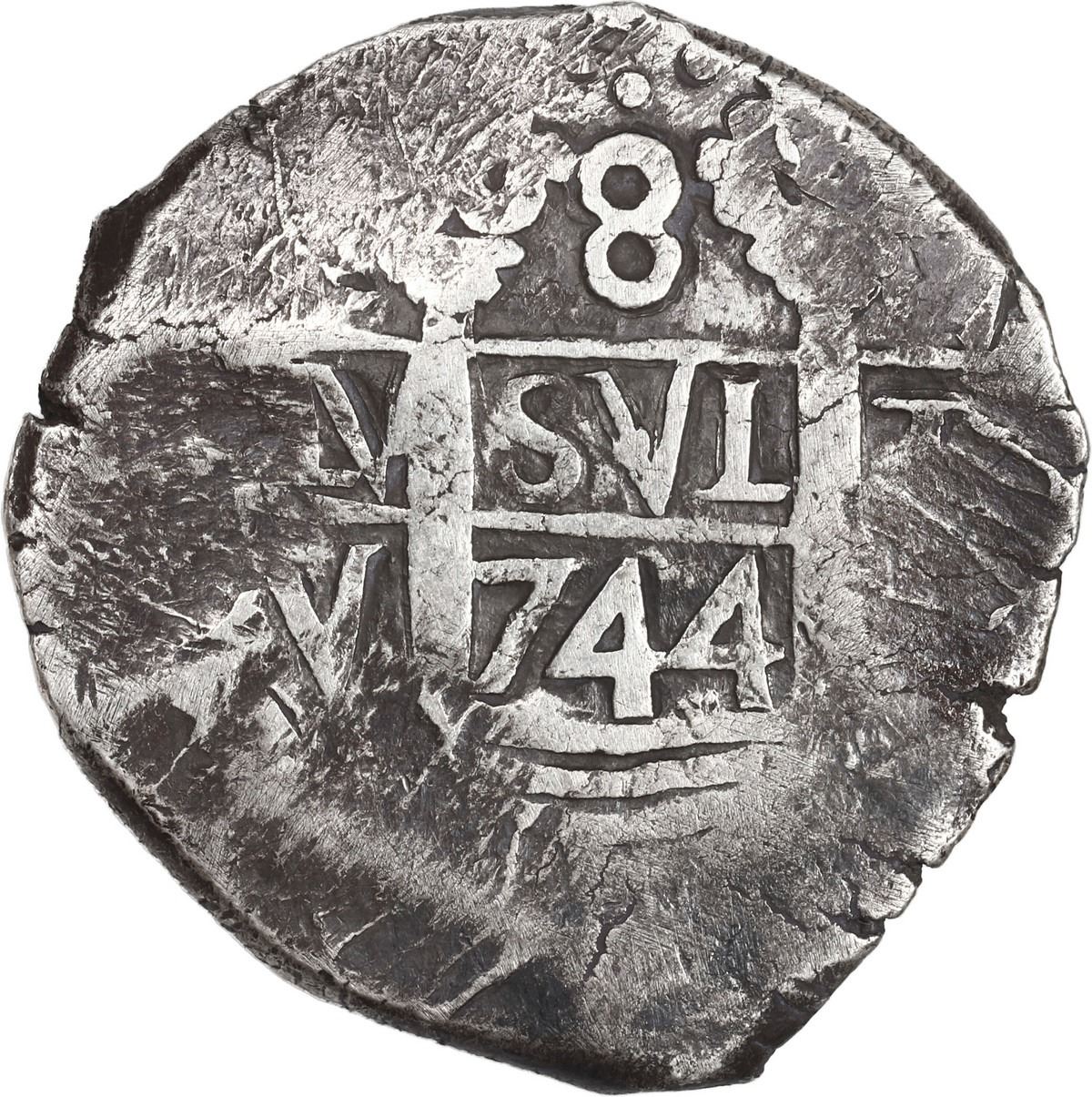 PERU, Lima, cob 8 reales, 1744 V, cross-of-five-dots at top, ex-Ugaz, ex-Rosenheim.