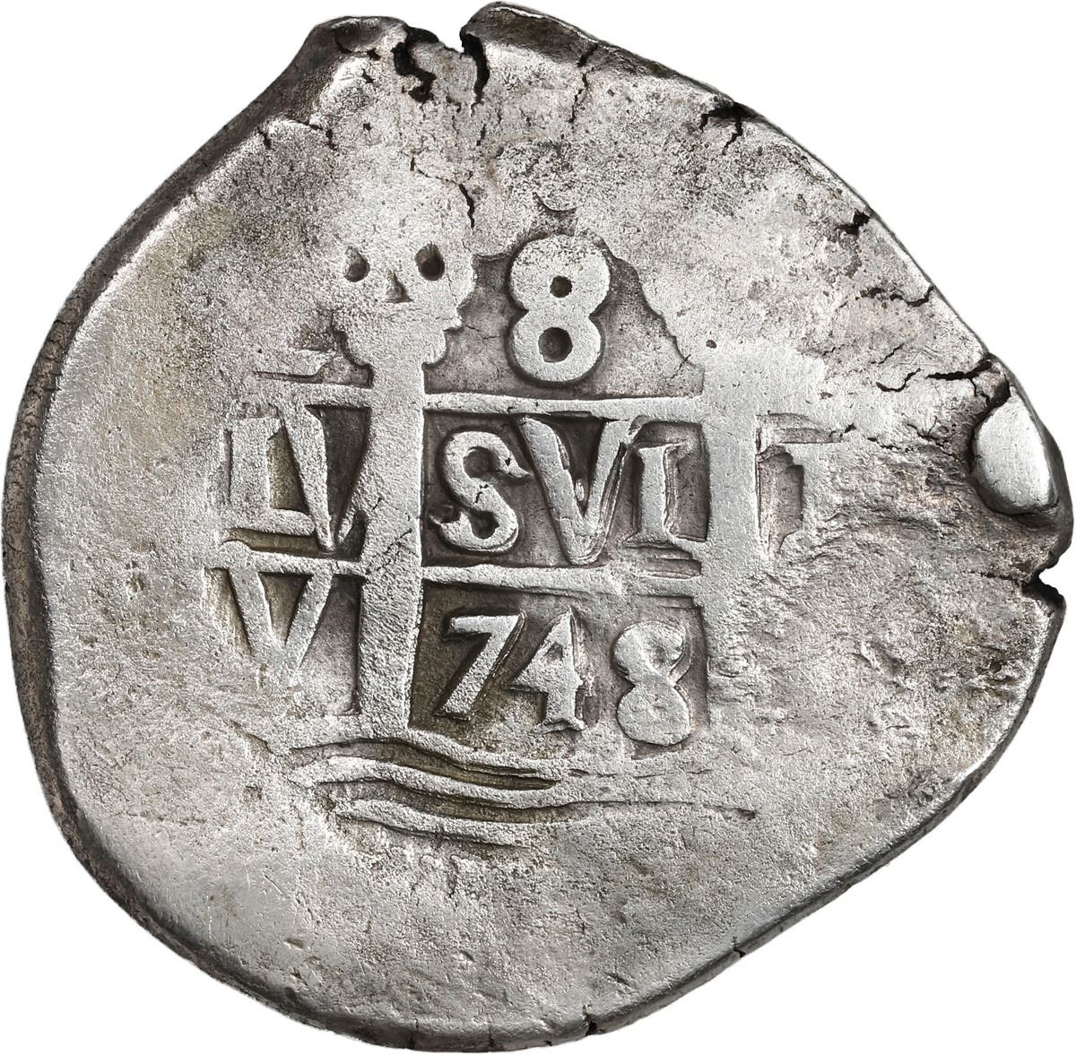 PERU, Lima, cob 8 reales, 1748 V, ex-Ugaz, Practical Book of Cobs Plate.