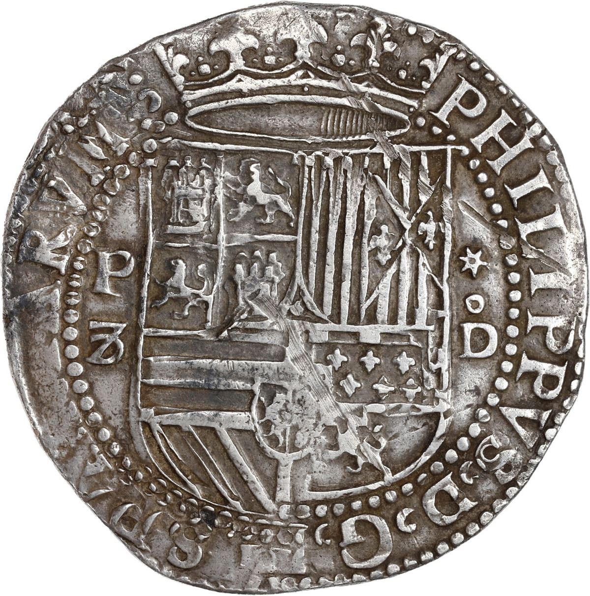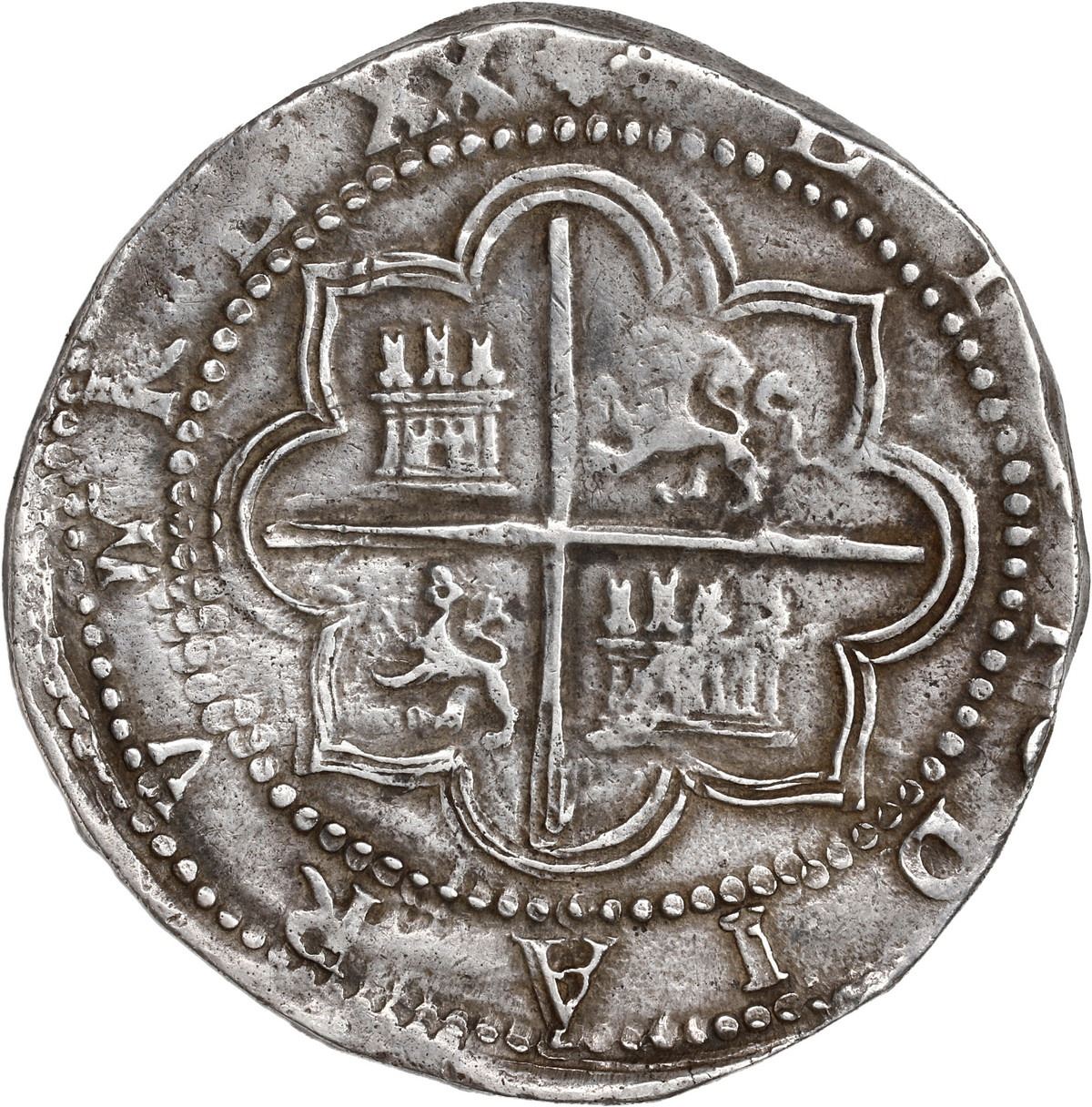 PERU, Lima, cob 8 reales, Philip II, assayer Diego de la Torre, P-8 (flat top) to left, *-oD to right, ex-Ugaz. S-L4; KM-14; Cal-655. 26.40 grams. Very broad flan with choice full crown and legends, beautifully toned AXF with some old scratches on shield, otherwise exemplary. Pedigreed to the Jorge Ugaz Collection.