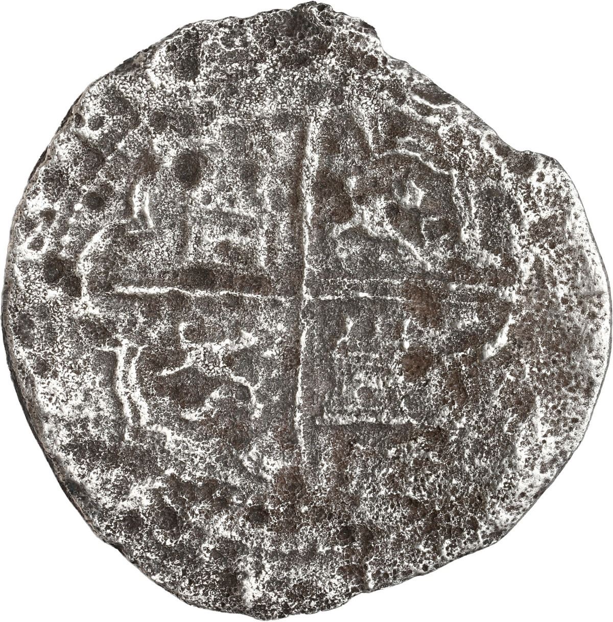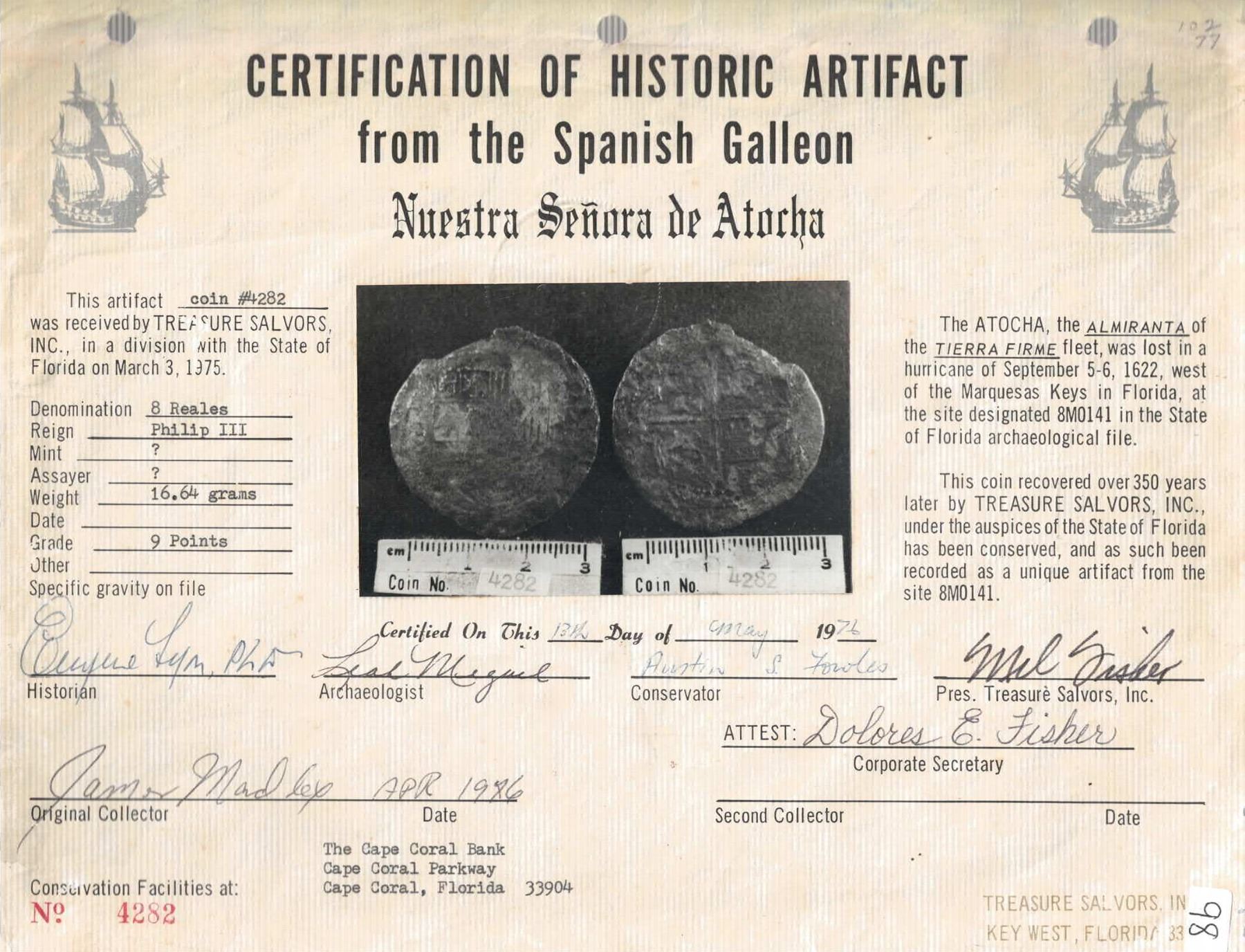 PERU, Lima, cob 8 reales, Philip II, assayer Diego de la Torre, P-8 to left, *-oD to right, "9 points" (Grade 3), with hand-signed photo-certificate from 1976. S-L4; KM-14; Cal-655. 16.64 grams. Nice full cross and shield despite moderate corrosion with associated thinning, lightly toned and a bit spotted, popular type. With original photo-certificate from 1976 (Cape Coral Bank) hand-signed by Mel and Delores Fisher, Eugene Lyon, Leah Miguel, and Austin Fowles. Recovered from: Atocha, sunk in 1622 west of Key West, Florida