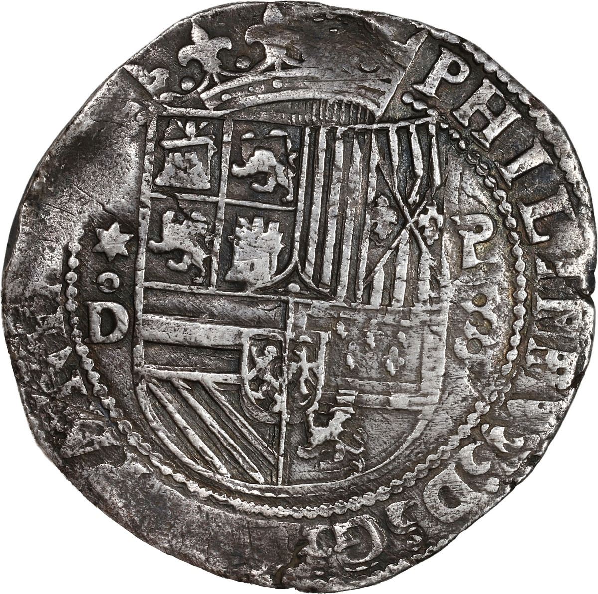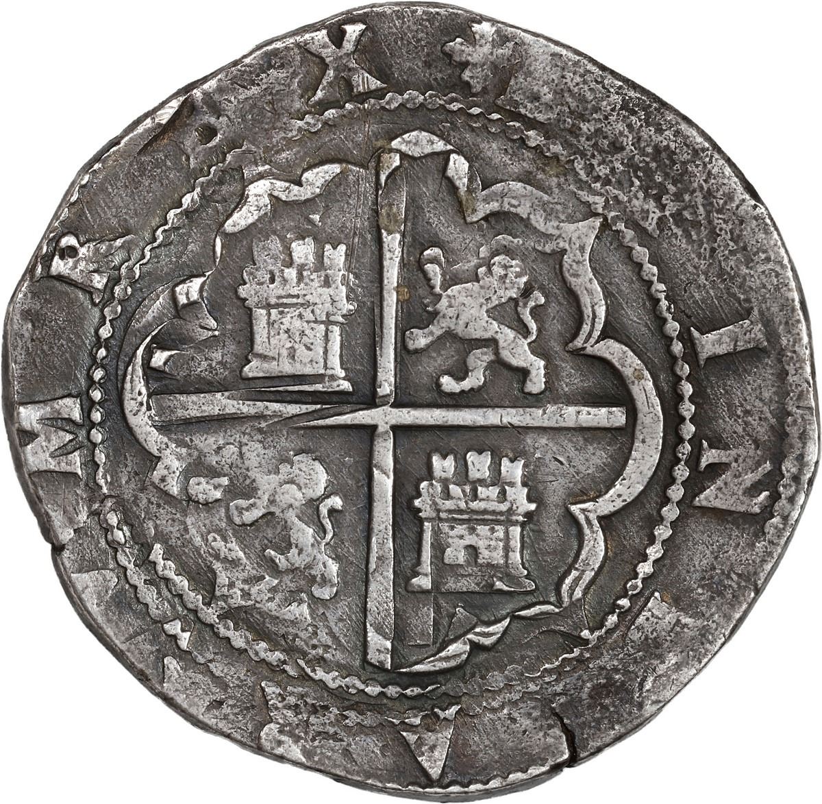 PERU, Lima, cob 8 reales, Philip II, assayer Diego de la Torre, *-oD to left, P-8 (round top) to right, ex-Ugaz, ex-von Schuckmann, ex-Sellschopp (Plate). S-L4; KM-14; Cal-657. 27.03 grams. Well-toned XF with choice full interior details and nearly full legends and crown, traces of doubling but very bold *-oD to left, a scarce variety that Sellschopp considered to be the final type for this assayer. Pedigreed to the Jorge Ugaz Collection, the von Schuckmann Collection (Renaissance auction of December 2001, lot 3170), and the Sellschopp Collection (Swiss Bank Corp. auction of October 1988, lot 139), also Plate Coin 129 in his book Las acuñaciones de las cecas de Lima, La Plata y Potosí (1971).