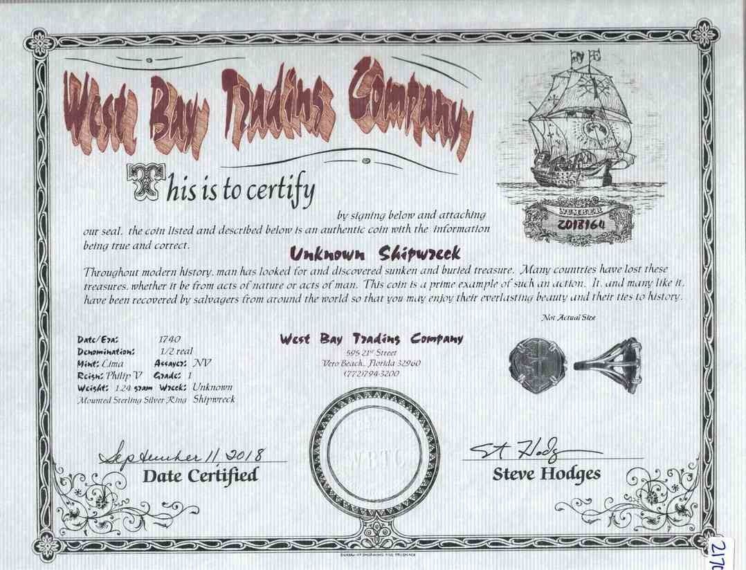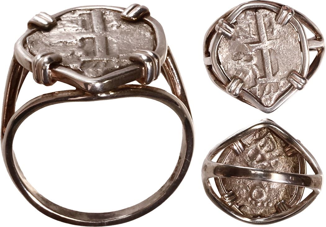 PERU, Lima, cob ½ real, 1740, mounted cross-side out in silver ladies' ring (size 6½). 4.02 grams total. Neat piece with clear date below bold partial cross, second date seen below bold monogram, rather lustrous. With photo-certificate.