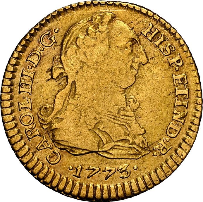 PERU, Lima, gold bust 1 escudo, Charles III, 1773 JM, NGC XF details / scratches, ex-Almenara. Cal-1338; Fr-35; KM-79. Broad flan with full rims, good luster, slightly weak bust with light scratches above, scarcer assayer for the date. Pedigreed to the Almenara Collection (stated on label).
