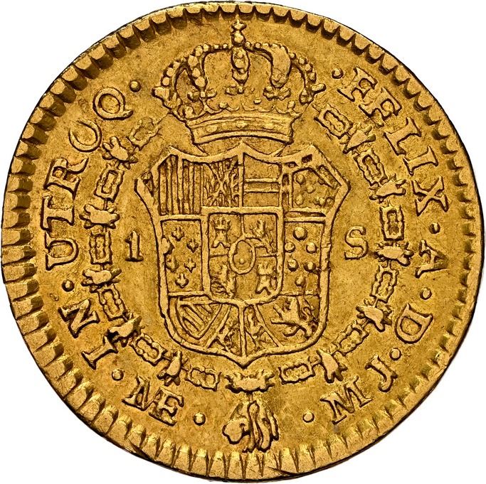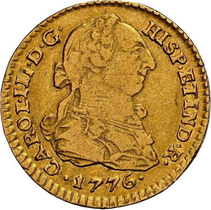 PERU, Lima, gold bust 1 escudo, Charles III, 1776 MJ, NGC XF details / edge damage, finest and only example in NGC census, ex-Almenara. Cal-1342; Fr-35; KM-79. Good strike with traces of luster, full rims but with almost entire edge design shaved off, popular date for U.S. collectors. Pedigreed to the Almenara Collection (stated on label).