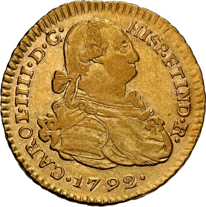 PERU, Lima, gold bust 1 escudo, Charles IV, 1792 IJ, large bust, NGC AU 50, finest known in NGC census, ex-Almenara. Cal-1084; Fr-43; KM-89. Strong luster for the assigned grade (this being the only straight-graded example at NGC), with full rims and only light high-point wear, distinctively oversized bust unique to this mint for this year and next, oddly singled out in Calicó only for this denomination. Pedigreed to the Almenara Collection (stated on label).