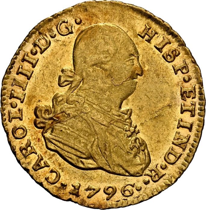 PERU, Lima, gold bust 1 escudo, Charles IV, 1796 IJ, NGC UNC details / rev spot removed, finest and only example in NGC census, ex-Almenara. Cal-1090; Fr-43; KM-89. Spectacular luster and sharpness of strike, the rims slightly weak (as made), with minor natural flaw in front of face and light scratch on head, area of light marks to right of crown on reverse, still far above the usual quality for this type. Pedigreed to the Almenara Collection (stated on label).