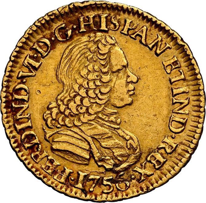 PERU, Lima, gold bust 1 escudo, Ferdinand VI, 1756 JM, second bust, very rare, NGC AU details / cleaned, finest and only example in NGC census, ex-Almenara. Cal-603; Fr-23; KM-56.2. Bold strike with full rims, reddish staining and encrustation here and there but removed from the bust. Pedigreed to the Almenara Collection (stated on label).