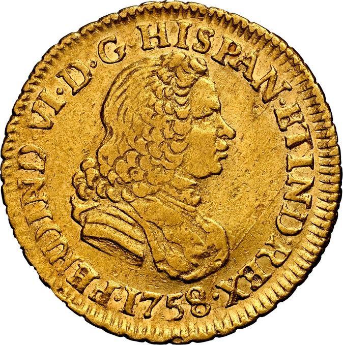 PERU, Lima, gold bust 1 escudo, Ferdinand VI, 1758 JM, second bust, very rare, NGC XF details / rev scratched, ex-Almenara. Cal-605; Fr-23; KM-56.2. Full rims with much original luster in legends (arguably AU) but the bust slightly weaker and with small marks all over (a few on reverse heavier, as noted on label). Pedigreed to the Almenara Collection (stated on label).