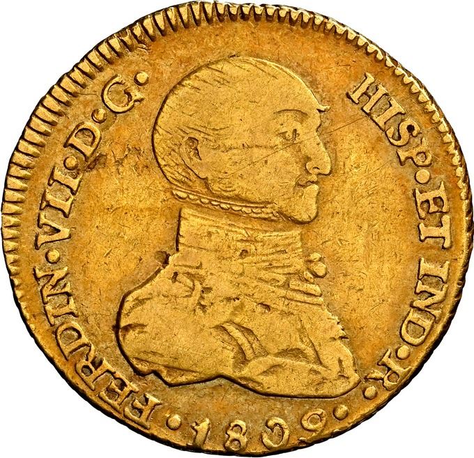 PERU, Lima, gold bust 1 escudo, Ferdinand VII transitional ("imaginary" bust), 1809 JP, extremely rare, NGC VF 25, finest and only example in NGC census, ex-Almenara. Cal-1496; Fr-47; KM-110. Rich gold color, with partially weak rims and several minor natural flaws but no damage, the rarest date (two known, by our records) of this three-year type with bust unique to this mint, in fact indicated as RARE in KM without values. Pedigreed to the Almenara Collection (stated on label).