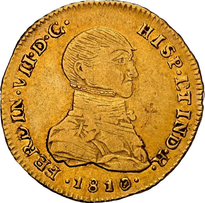 PERU, Lima, gold bust 1 escudo, Ferdinand VII transitional ("imaginary" bust), 1810 JP, very rare, NGC XF 40, ex-Clapp, ex-Eliasberg, ex-Almenara. Cal-1496; Fr-47; KM-110. Good luster, the distinctive bust just slightly weak (in fact probably closer to AU grade), traces of encrustation in crevices and very minor natural flaw in field in front of face, desirable pedigree. Pedigreed to the Eliasberg Collection (American Numismatic Rarities auction of April 2005, lot 3509, acquired from the J. Clapp Estate in 1942), and to the Almenara Collection (both stated on label).