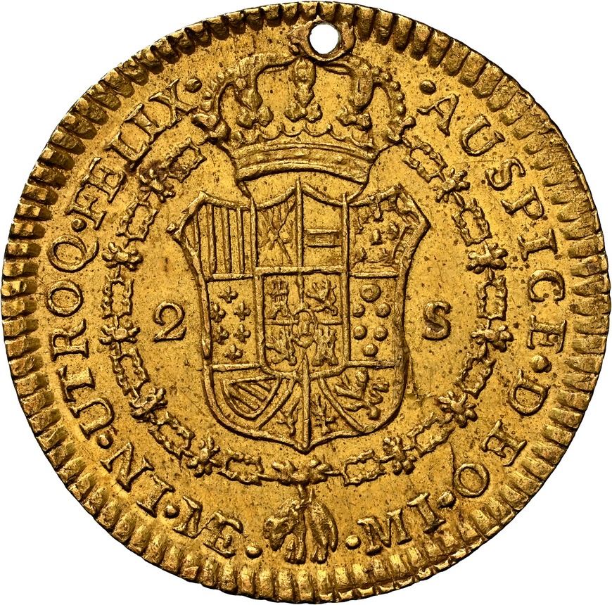 PERU, Lima, gold bust 2 escudos, Charles III, 1785 MI, rare, NGC AU details / holed, finest and only example in NGC census, ex-Almenara. Cal-1537; Fr-34; KM-80a. Choice full details (lightly marked UNC, in our opinion) with strong luster, full rims, minor natural flaw at about 4 o'clock on reverse, the hole at top very small and old. Pedigreed to the Almenara Collection (stated on label).