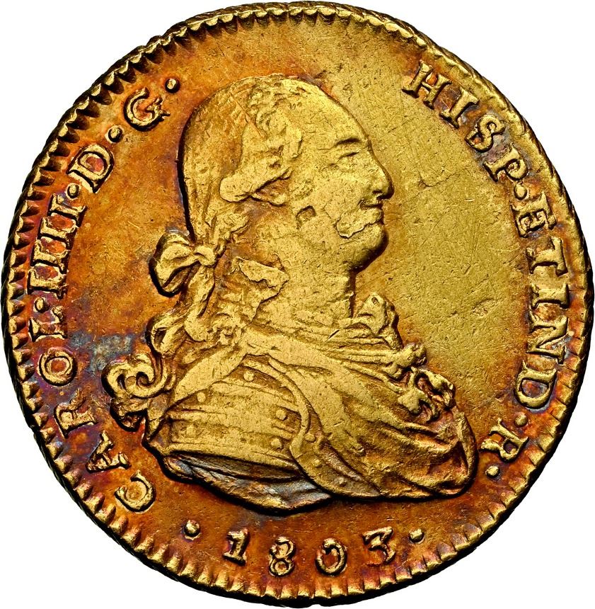 PERU, Lima, gold bust 2 escudos, Charles IV, 1803 JP, extremely rare, NGC AU details / obv cleaned, finest and only example in NGC census, ex-Almenara. Cal-unl (Type 141); Fr-42; KM-unl (100 for type). Deep purple toning all over except for field in front of face (the "cleaned" part note by NGC), with underlying luster, minor lamination flaws on bust, another date (like last lot) that is not listed in any reference (including Murray, de la Puente, Calicó, KM, etc), hence possibly unique. Pedigreed to the Almenara Collection (stated on label).