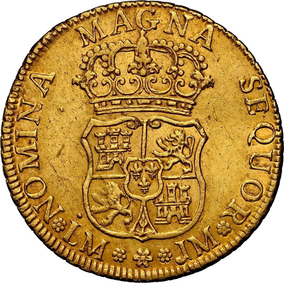 PERU, Lima, gold bust 4 escudos, Charles III, 1762 JM, first bust, very rare, NGC AU details / bent, obv spot removed, ex-Caballero, ex-Almenara. Cal-1747; Fr-25; KM-67. Rich gold color and fully detailed strike with hints of luster and toning, minor marks and light wear only, long old scratch on bust and with slight bend in flan, a two-year type so rare that Friedberg uncharacteristically gives no values, this coin featured on an entire page in the Caballero catalog, which points out that this ephemeral bust was the same used on Lima's proclamation medals. Pedigreed to the Caballero de las Indias Collection (Aureo & Calicó auction of April 2009, lot 603) and to the Almenara Collection (both stated on label).