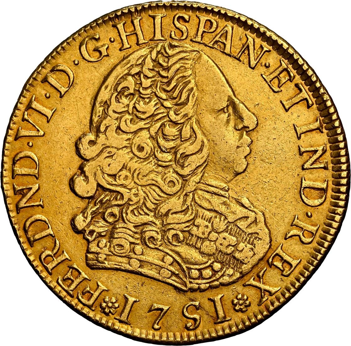 PERU, Lima, gold bust 4 escudos, Ferdinand VI, 1751 J, first bust, NGC AU details / cleaned, finest and only example in NGC census, ex-Almenara. Cal-693; Fr-17; KM-49. Rich gold color with minimal luster and light wear but no appreciable hairlines, first date of issue and the beginning of an unprecedented offering of Lima 4 escudos, all of which are rare and seldom offered (the present type, for example, missing in both Eliasberg and Caballero, to name just two important collections) and in many cases represented in the NGC census by only the coins presented in this auction (as is the case with the present lot). Pedigreed to the Almenara Collection (stated on label).