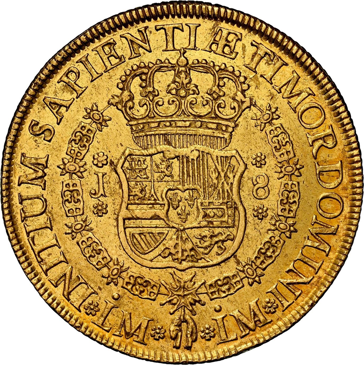PERU, Lima, gold bust 8 escudos, Ferdinand VI, 1751 J, first bust, NGC MS 61, ex-Voetter, ex-Eliasberg, ex-Almenara. Cal-764; Fr-16; KM-50. Choice strike with ample luster, a modicum of small marks and hairlines but overall a very desirable example for this first year of issue, especially considering its 80-year pedigree. Pedigreed to the Voetter Collection (B. Max Mehl auction of January 1943, lot 287), the Eliasberg Collection (American Numismatic Rarities auction of April 2005, lot 3466), and the Almenara Collection (all stated on label).