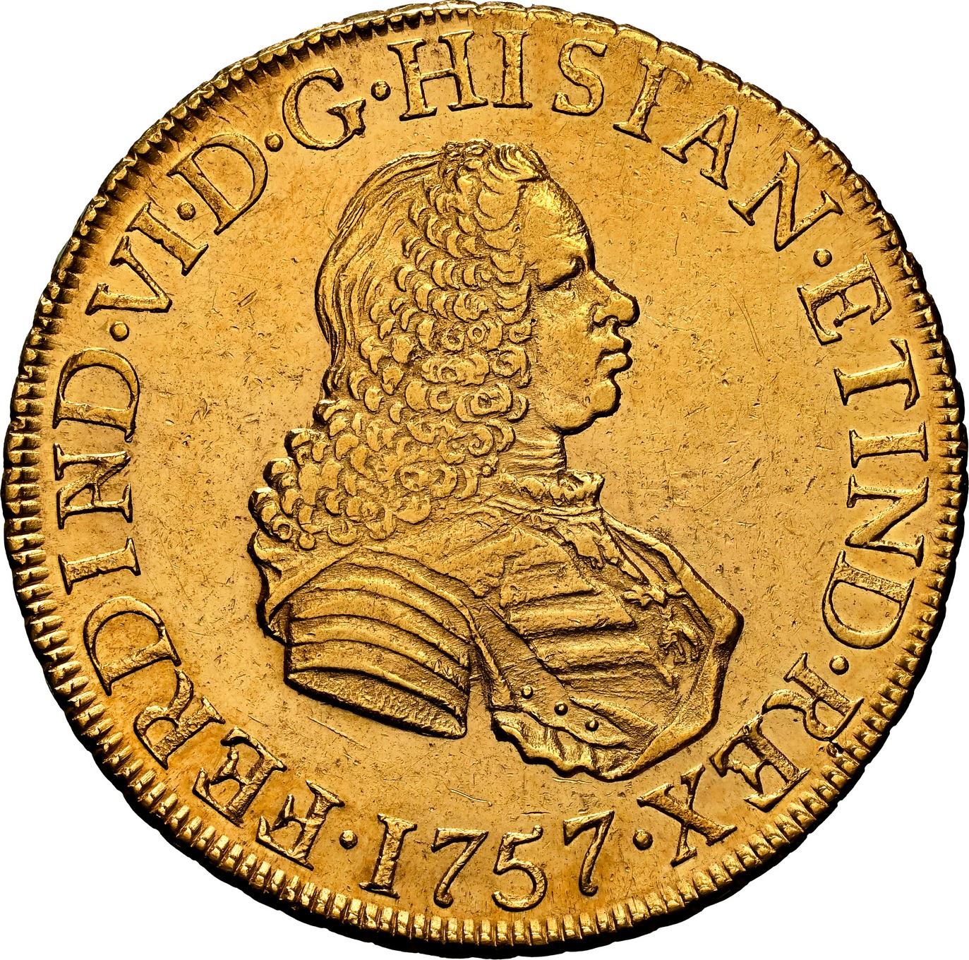 PERU, Lima, gold bust 8 escudos, Ferdinand VI, 1757 JM, second bust, NGC AU details / cleaned, ex-Al