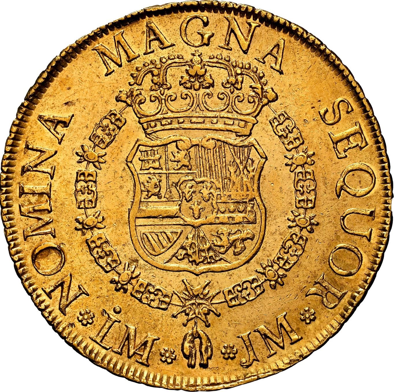 PERU, Lima, gold bust 8 escudos, Ferdinand VI, 1757 JM, second bust, NGC AU details / cleaned, ex-Almenara. Cal-772; Fr-20; KM-59.2. Fully detailed (more like UNC in our opinion) with choice luster all over, no more than typical marks and hairlines. Pedigreed to the Almenara Collection (stated on label).