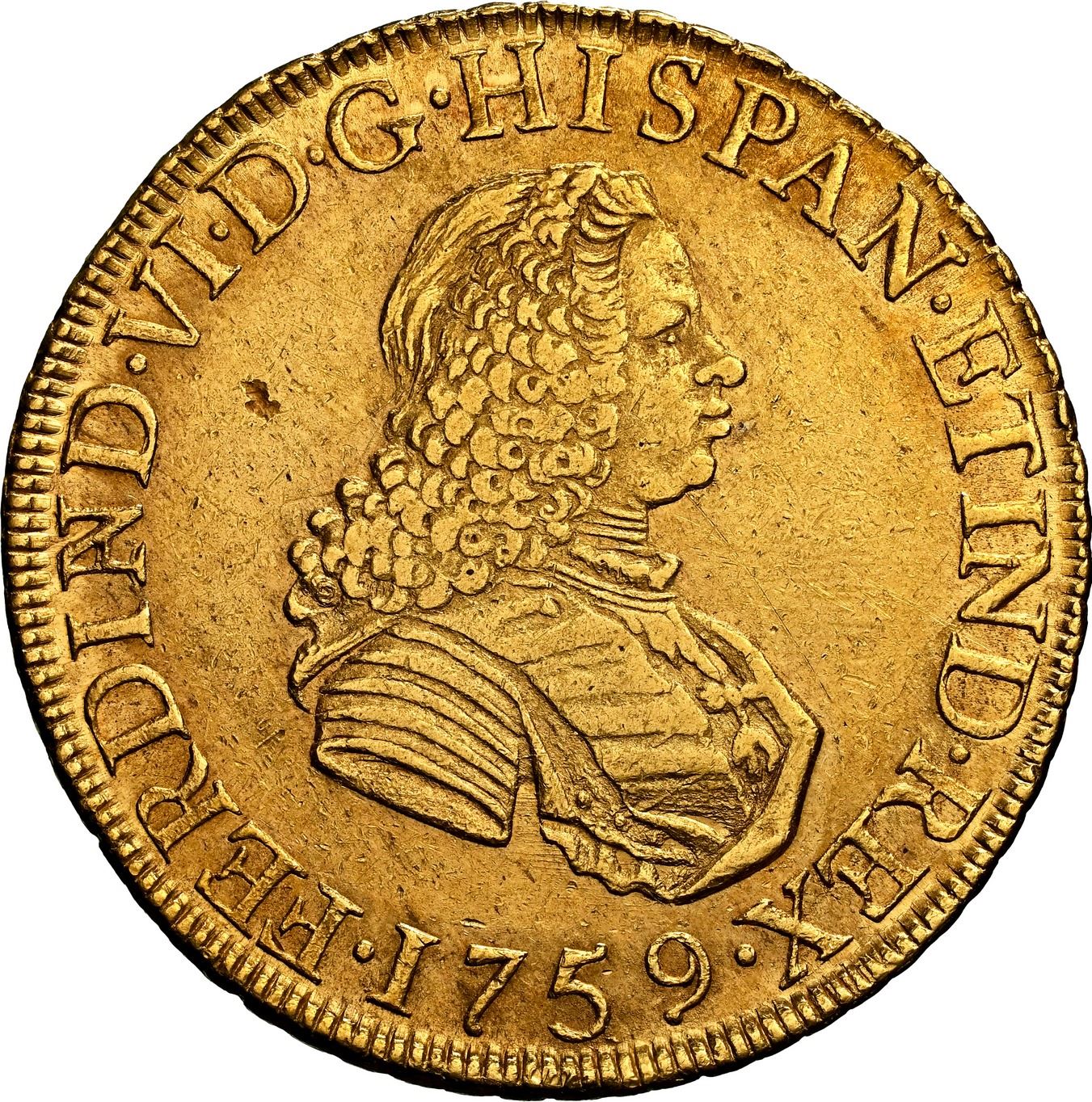 PERU, Lima, gold bust 8 escudos, Ferdinand VI, 1759 JM, second bust, NGC AU 55, ex-Almenara. Cal-775; Fr-20; KM-59.2. Well-detailed strike with muted luster, slightly grainy surfaces and with small marks within the confines of the assigned grade, tiny flaw in field behind head (as made). Pedigreed to the Almenara Collection (stated on label).
