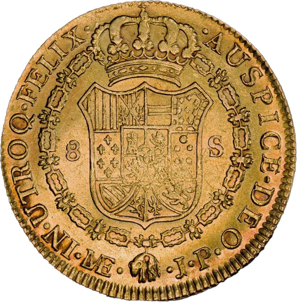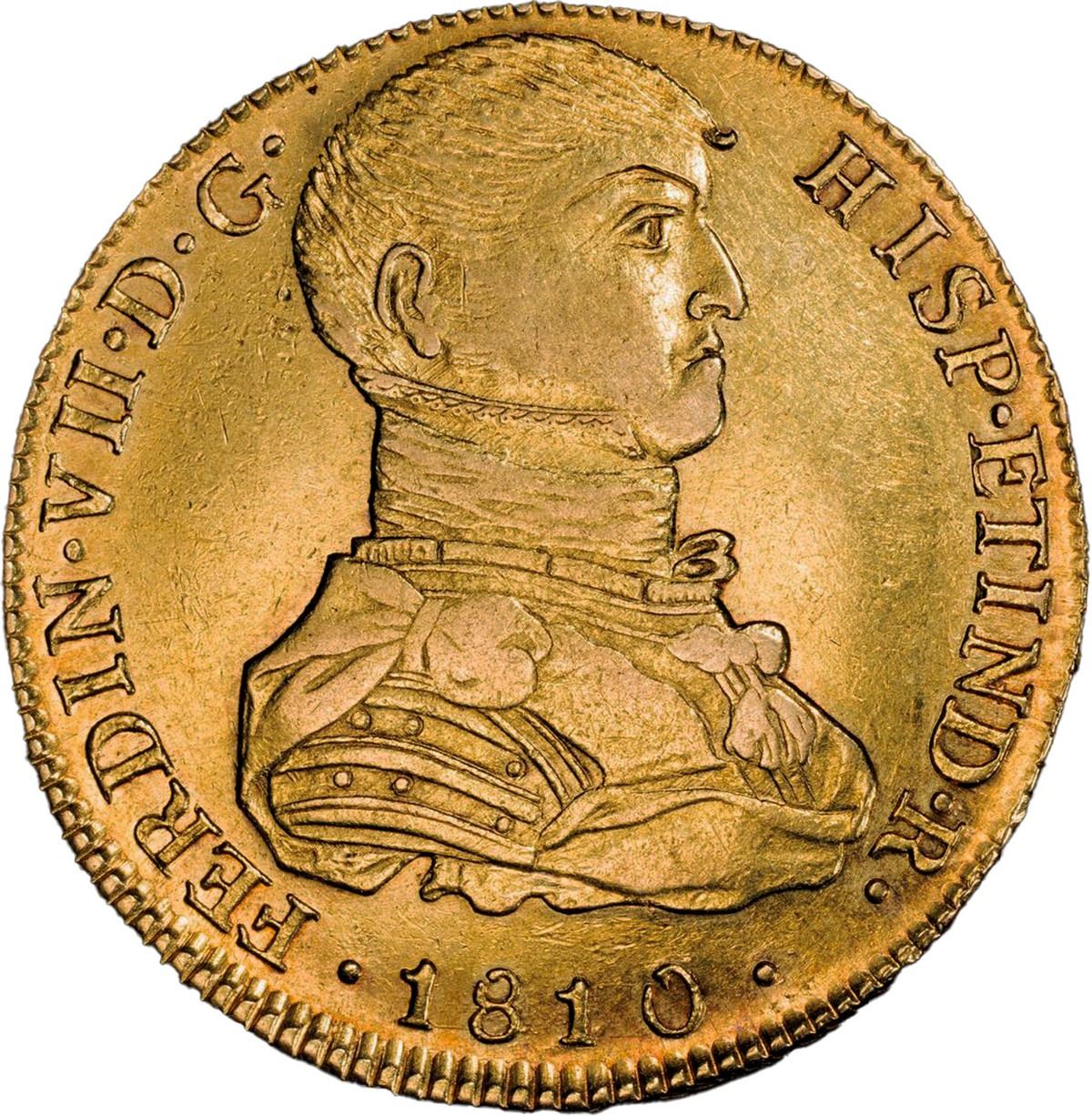 PERU, Lima, gold bust 8 escudos, Ferdinand VII transitional ("imaginary" bust), 1810 JP, PCGS AU55. Cal-1755; KM-107; Fr-44. Choice strike (also full rims) with great luster for the assigned grade, just a little weak in shield as usual, nice gold color, desirable four-year transitional type with "indigenous" rendering of an armored Ferdinand VII.