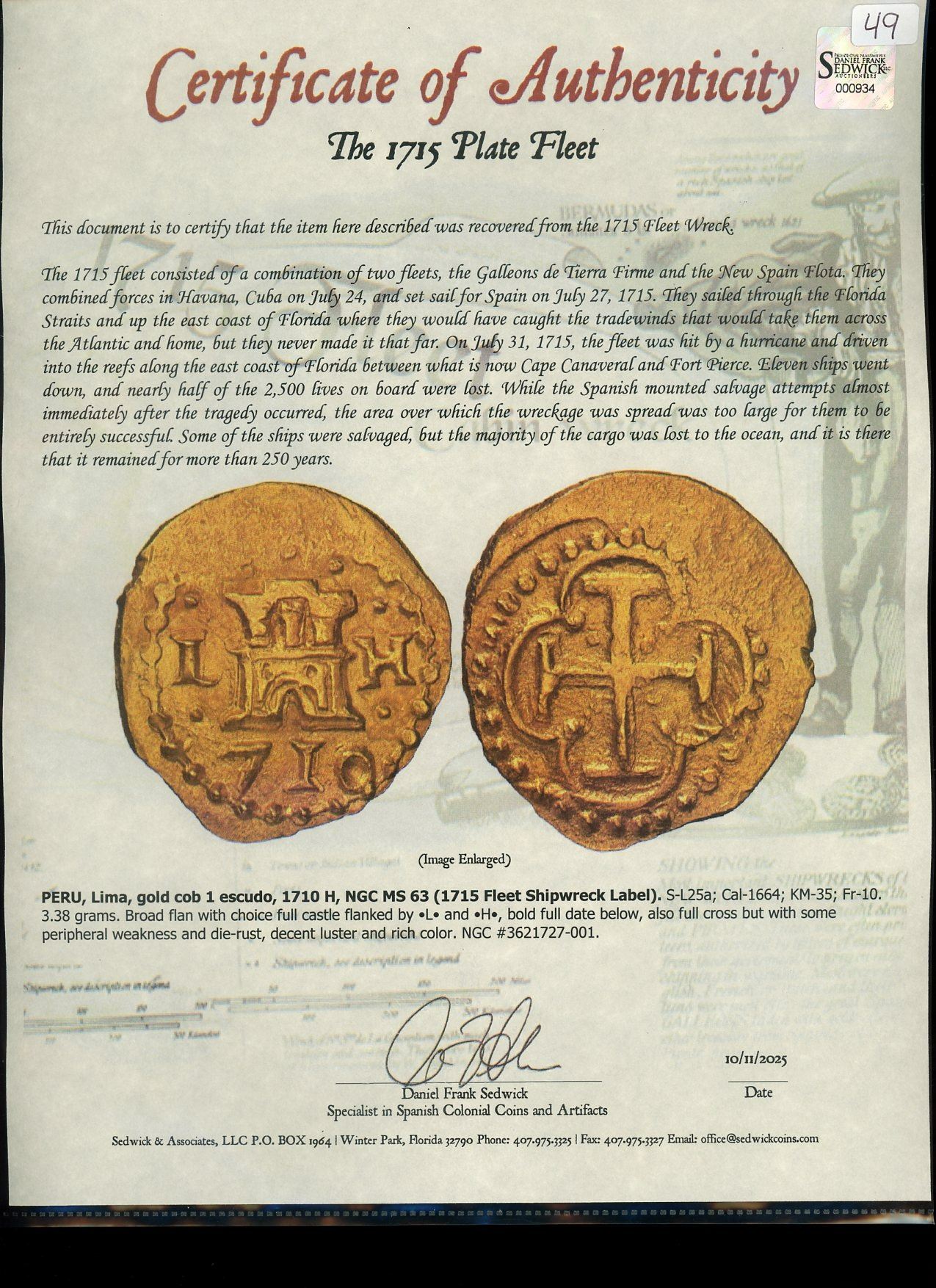 PERU, Lima, gold cob 1 escudo, 1710 H, NGC MS 63 (1715 Fleet Shipwreck Label), ex-McGregor. S-L25a; Cal-1664; KM-35; Fr-10. 3.38 grams. Broad flan with choice full castle flanked by •L• and •H•, bold full date below, also full cross but with some peripheral weakness and die-rust, decent luster and rich color, second finest of just three in the NGC census (the others being AU 58 and MS 65). From the 1715 Fleet, with Sedwick photo-certificate, pedigreed to the McGregor Collection (stated on label).