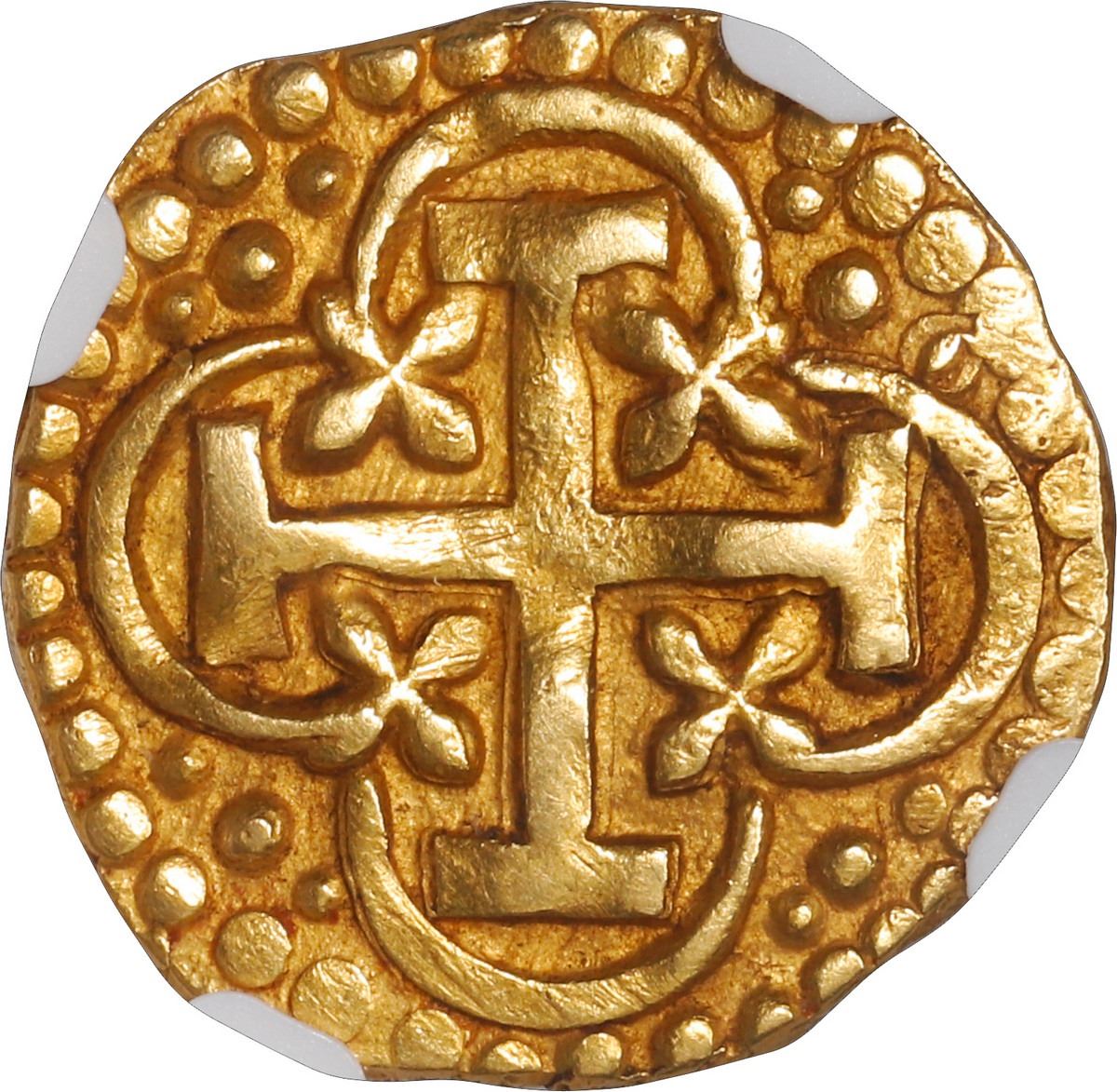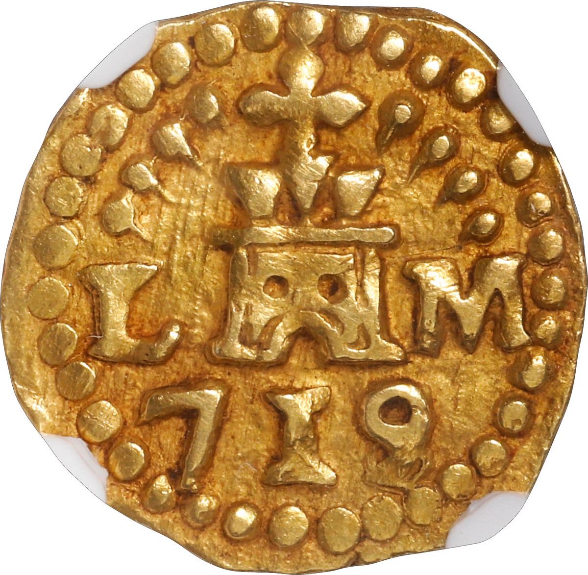 PERU, Lima, gold cob 1 escudo, 1719/8 M, rare, NGC AU 58, "top pop." S-L28; Cal-1676; KM-unl (35 for type). 3.36 grams. Broad flan with 100% complete borders of dots in addition to the bold full inner details, all nicely toned in crevices for good contrast, the overdate clear and unmistakable (unlisted in KM), currently tied with just one other for finest in the NGC census.