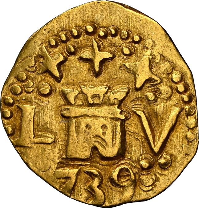 PERU, Lima, gold cob 1 escudo, 1739 V, extremely rare, NGC AU 53, finest and only example in NGC census, ex-Almenara. S-L30; Cal-unl (Type 197); Fr-10; KM-unl (35 for type). 3.24 grams. Very broad flan with full details, particularly the bold assayer and date (a combination not listed in Calicó and KM), first example we have seen or heard of. Unlike the previous and succeeding lots, this appears to be a clean date, although the 9 was possibly re-punched. Pedigreed to the Almenara Collection (stated on label).