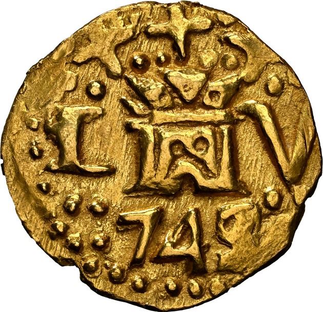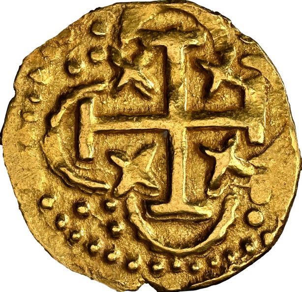 PERU, Lima, gold cob 1 escudo, 1745/4 V, extremely rare, NGC AU details / cleaned, finest and only example in NGC census, ex-Almenara. S-L30; Cal-unl (Type 197); Fr-10; KM-unl (35 for type). 3.39 grams. Bold full details on both sides (the cross slightly off-center), bold overdate (unlisted in Calicó and KM and the first we have seen or heard of), light yellow in color as lacking original toning. Pedigreed to the Almenara Collection (stated on label).