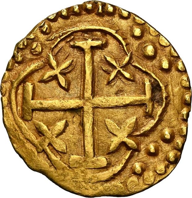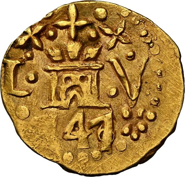 PERU, Lima, gold cob 1 escudo, 1747/6 V, extremely rare, NGC MS 62, finest and only example in NGC census, ex-Sellschopp, ex-Almenara, KM Plate. S-L30a; Cal-593; Fr-15; KM-45. 3.28 grams. Broad flan with satin-smooth fields (small bits of dark sediment), choice full cross, full but off-center castle-side details including very bold overdate, which presumably spans the transition from Philip V to Ferdinand VI but without any legend to confirm. Note this coin is featured on the first page of color plates in the Sellschopp auction catalog. We have not seen another example, so we suspect that no others exist and that the catalog references are all generated from this one coin. Pedigreed to the Sellschopp Collection (Swiss Bank Corp. auction of September 1988, lot 249) and to the Almenara Collection, Plate Coin in KM's Standard Catalogs (all stated on label), also pedigreed to the Glendining auction of March 1936 (lot 349).