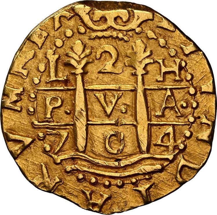 PERU, Lima, gold cob 2 escudos, 1704 H, rare, NGC AU 58, "top pop," ex-Almenara. S-L25a; Cal-1821; Fr-9; KM-36. 6.69 grams. Broad flan with much full legend including PHILIPPVS V, nice full pillars-and-waves (perfectly centered) and cross-lions-castles, the latter with light high-point rub, faintly toned, tied with one other for finest in the NGC census. Pedigreed to the Sotheby's (London) auction of October 1992 (lot 113), the UBS auction of September 1997 (lot 2356), the Glendining Auction of June 1937 (lot 390), and the Almenara Collection (stated on label).