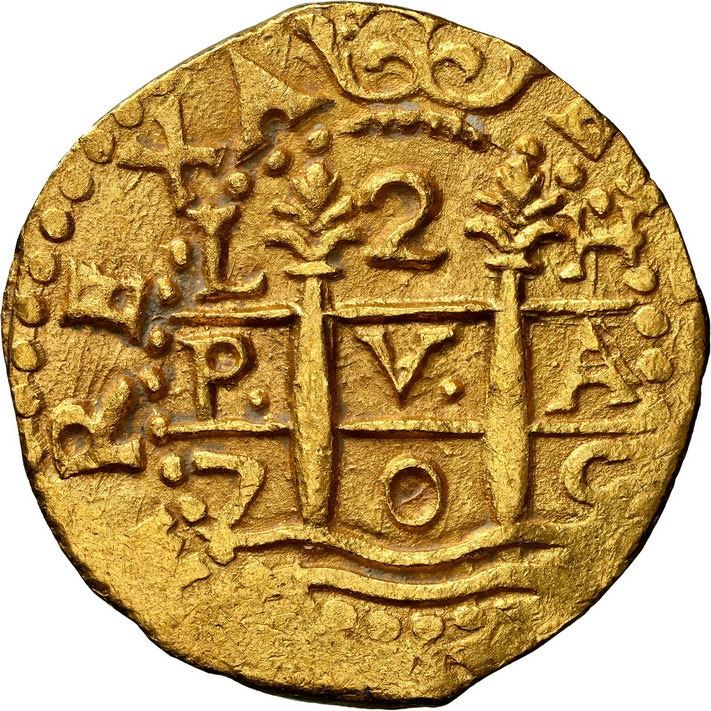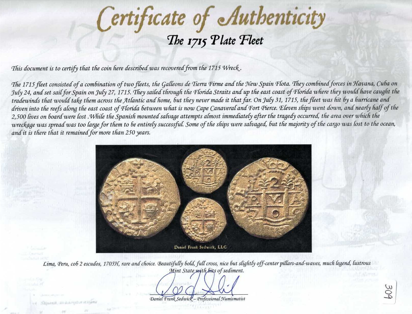 PERU, Lima, gold cob 2 escudos, 1705 H, rare, NGC MS 63 (1715 Fleet Shipwreck Label), finest known in the NGC census. S-L25a; KM-36; Cal-1822; Fr-9. Choice full pillars-and-waves and cross-lions-castles, both with traces of encrustation in crevices, currently the finest of six in the NGC census and desirable thus. Pedigreed to Sedwick Auction 6, with original lot-tag 36 and Sedwick photo-certificate. Recovered from: Spanish 1715 Fleet, sunk off the east coast of Florida