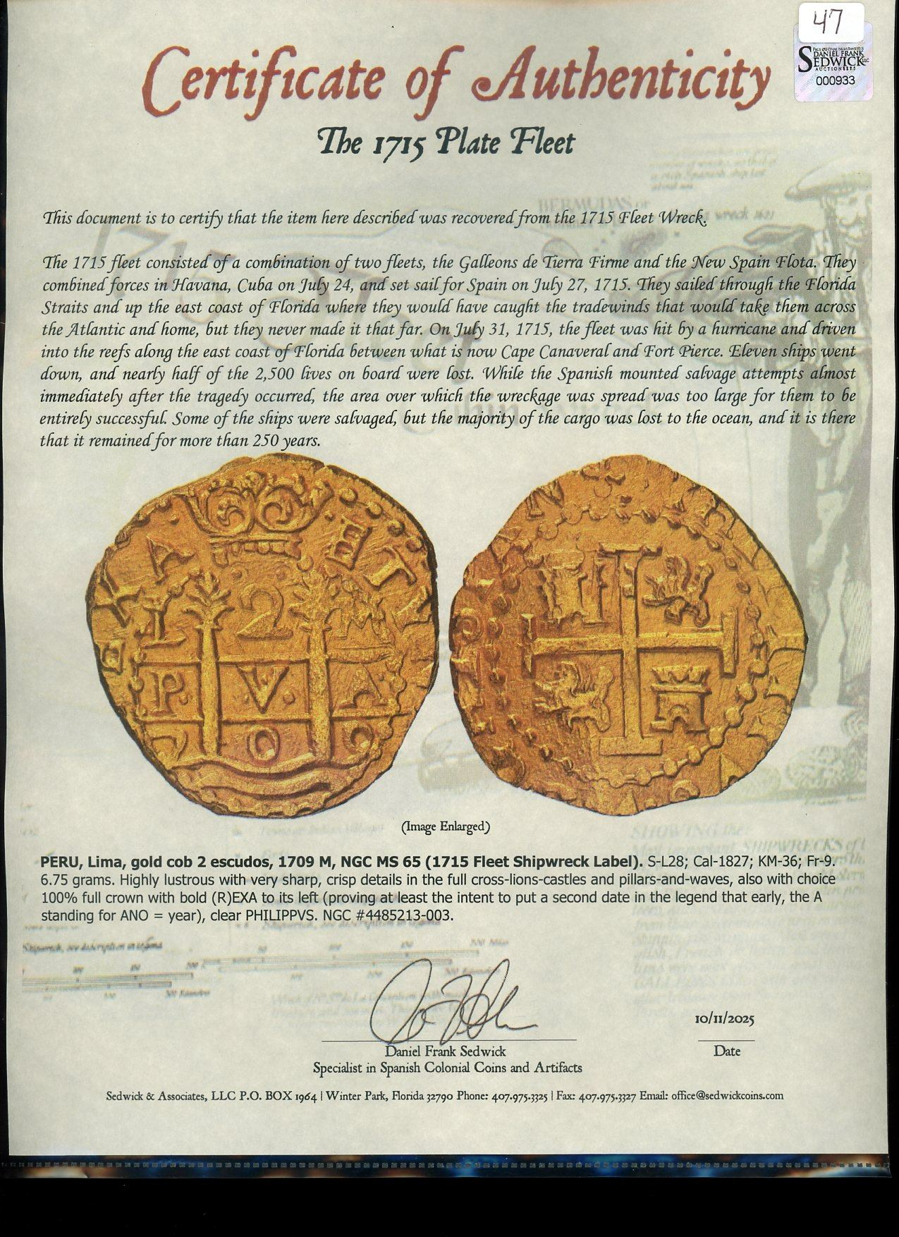 PERU, Lima, gold cob 2 escudos, 1709 M, NGC MS 65 (1715 Fleet Shipwreck Label), "top pop," ex-McGregor. S-L28; Cal-1827; KM-36; Fr-9. 6.75 grams. Highly lustrous with very sharp, crisp details in the full cross-lions-castles and pillars-and-waves, also with choice 100% full crown with bold (R)EXA to its left (proving at least the intent to put a second date in the legend that early, the A standing for ANO = year), clear PHILIPPVS, tied with two others (inexplicably listed as "1709 Philip V") for finest in the NGC census. From the 1715 Fleet, with Sedwick photo-certificate, pedigreed to the McGregor Collection (stated on label).