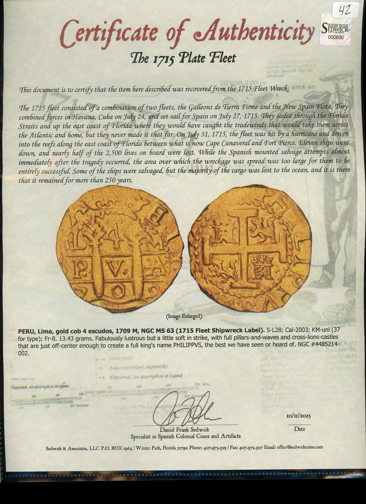 PERU, Lima, gold cob 4 escudos, 1709 M, rare, NGC MS 63 (1715 Fleet Shipwreck Label), finest known in NGC census, ex-McGregor. S-L28; Cal-2003; KM-unl (37 for type); Fr-8. 13.43 grams. Fabulously lustrous but a little soft in strike, with full pillars-and-waves and cross-lions-castles that are just off-center enough to create a full king's name PHILIPPVS, the best we have seen or heard of. From the 1715 Fleet, with Sedwick photo-certificate, pedigreed to the McGregor Collection (stated on label).