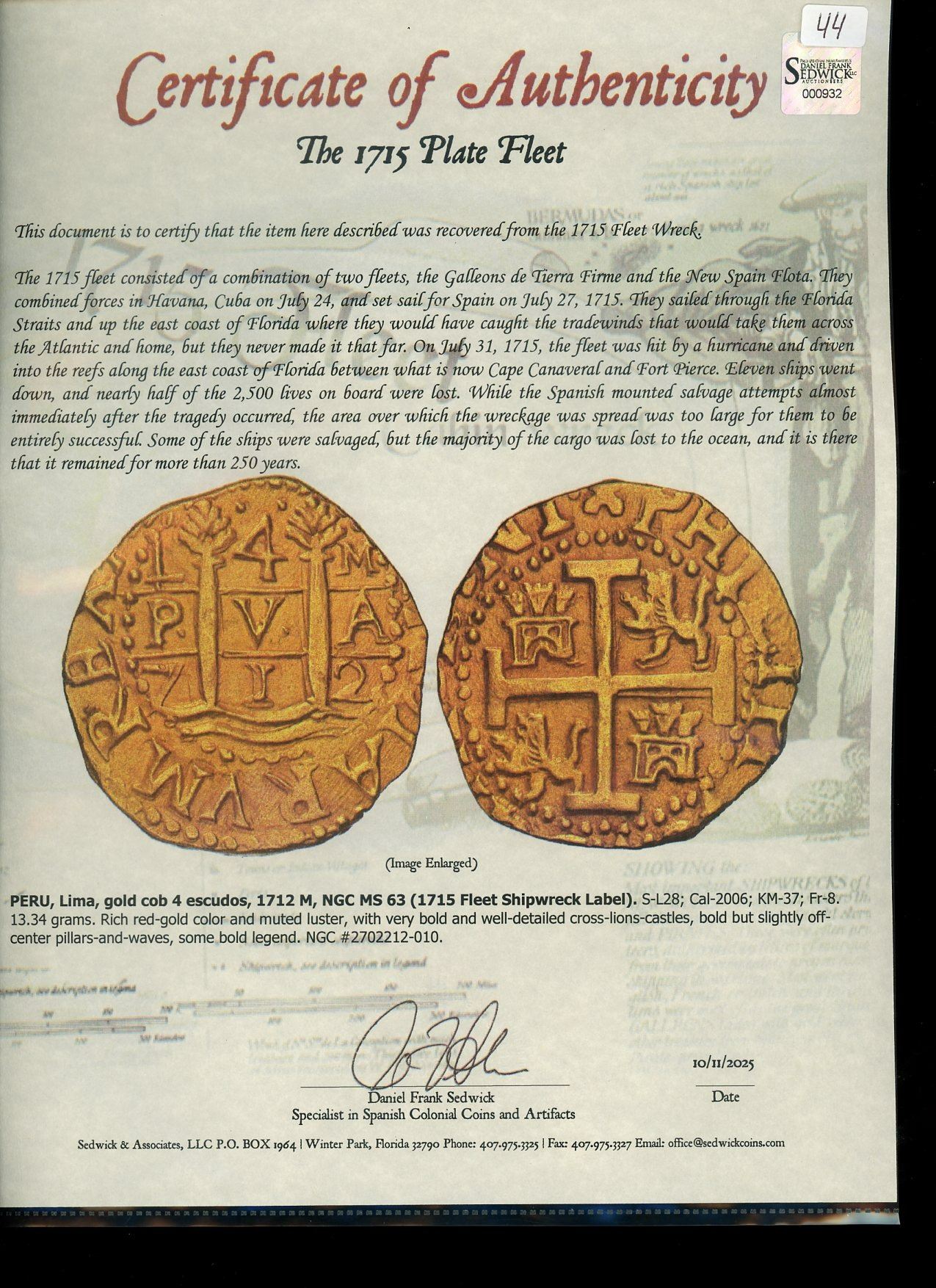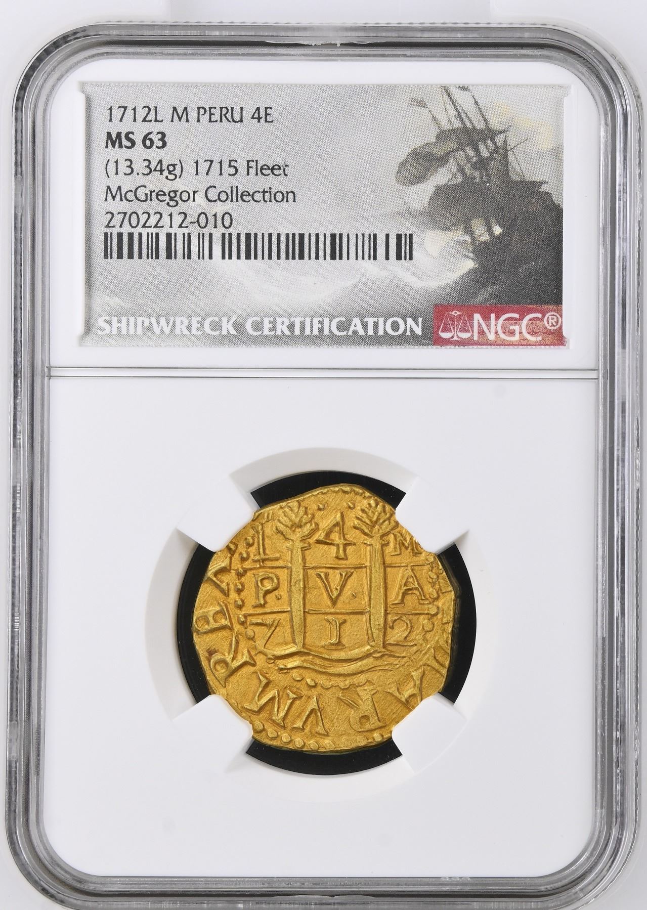 PERU, Lima, gold cob 4 escudos, 1712 M, rare, NGC MS 63 (1715 Fleet Shipwreck Label), "top pop," ex-McGregor. S-L28; Cal-2006; KM-37; Fr-8. 13.34 grams. Rich red-gold color and muted luster, with very bold and well-detailed cross-lions-castles, bold but slightly off-center pillars-and-waves, some bold legend, tied with one other for finest in the NGC census. From the 1715 Fleet, with Sedwick photo-certificate, pedigreed to the McGregor Collection (stated on label).