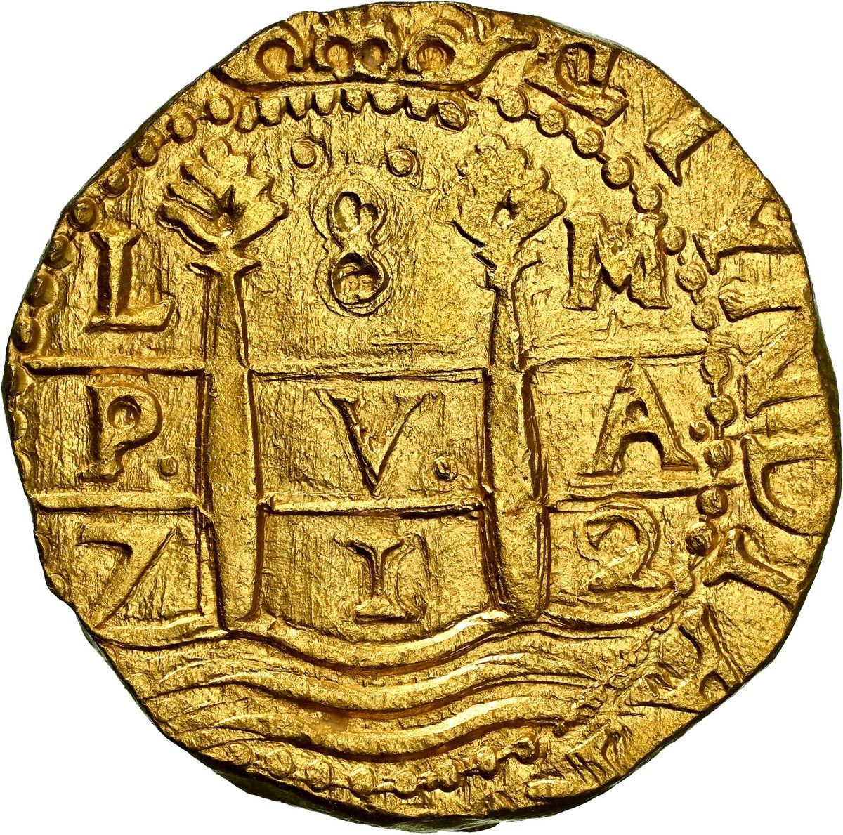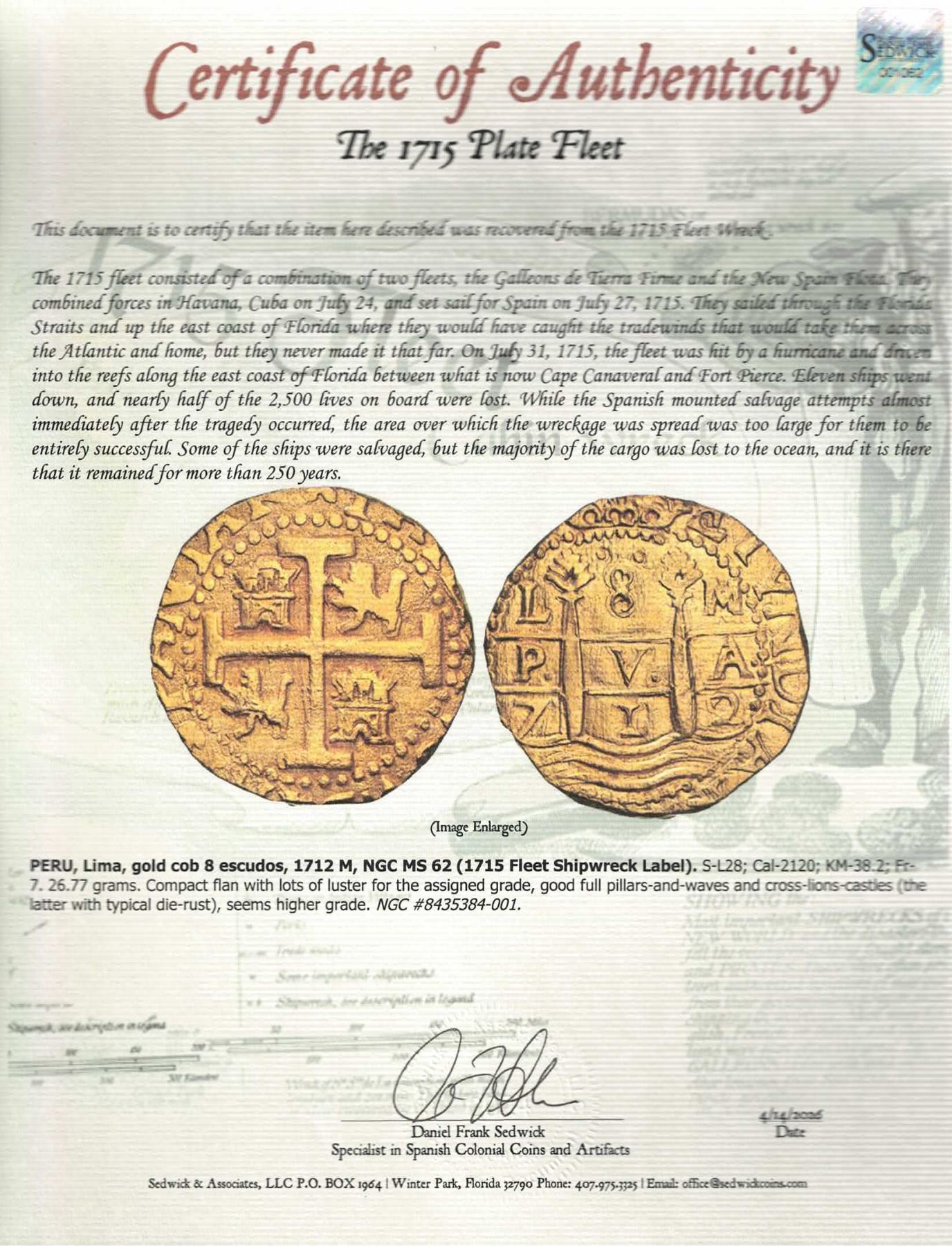 PERU, Lima, gold cob 8 escudos, 1712 M, NGC MS 62 (1715 Fleet Shipwreck Label). S-L28; Cal-2120; KM-38.2; Fr-7. 26.77 grams. Compact flan with lots of luster for the assigned grade, good full pillars-and-waves and cross-lions-castles (the latter with typical die-rust), seems higher grade. From the 1715 Fleet, with photo-certificate, pedigreed to the Stack's auction of October 1977 (lot 627).