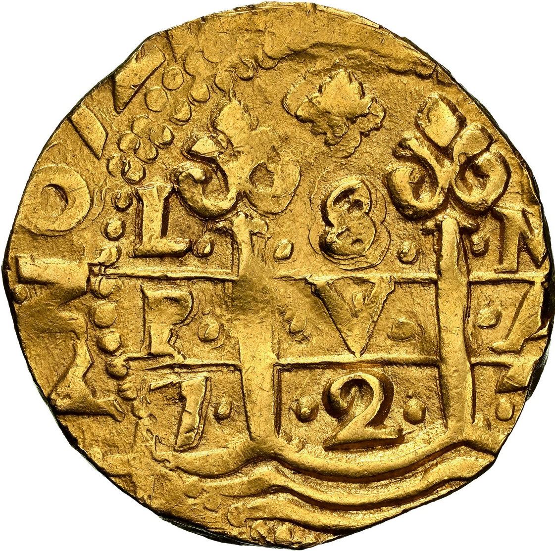 PERU, Lima, gold cob 8 escudos, 1727 M, NGC AU 58. S-L28b; KM-38.2; Cal-2139; Fr-7. 26.83 grams. Bold full pillars-and-waves and cross-lions-castles but both slightly off-center, in the former case enabling visibility of the bottoms of the second date 727 in the legend and in the latter case making for a clear (PHIL)IPPVS V, no toning but rich gold color all over.