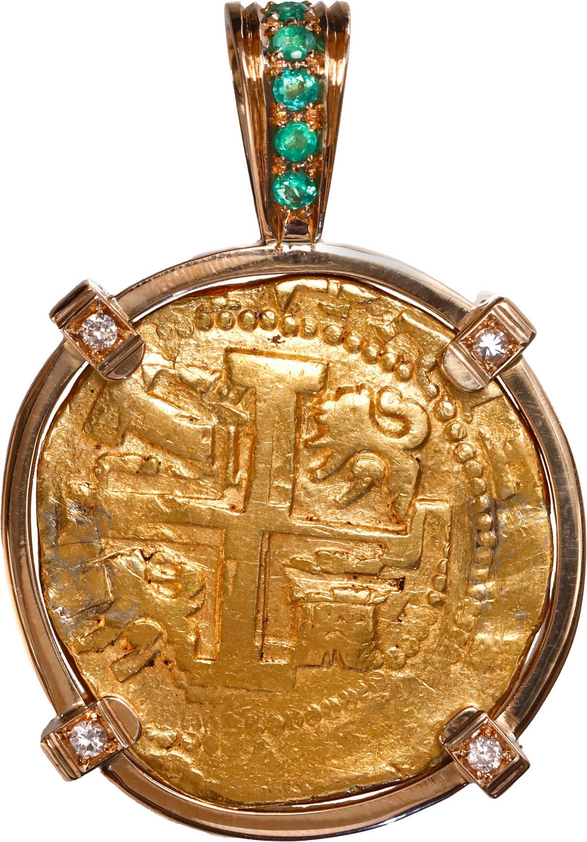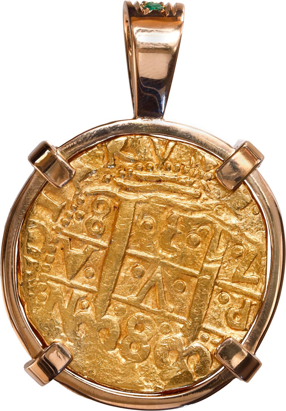 PERU, Lima, gold cob 8 escudos, 1738 N, mounted cross-side out in 18k gold pendant with fixed bail with emerald and diamond embellishments. S-L29; KM-38.2; Cal-2153; Fr-7. 38.17 grams total. About XF with full and slightly doubled cross, nice bold pillars with clear date along with partial legend, rich golden toned surfaces.