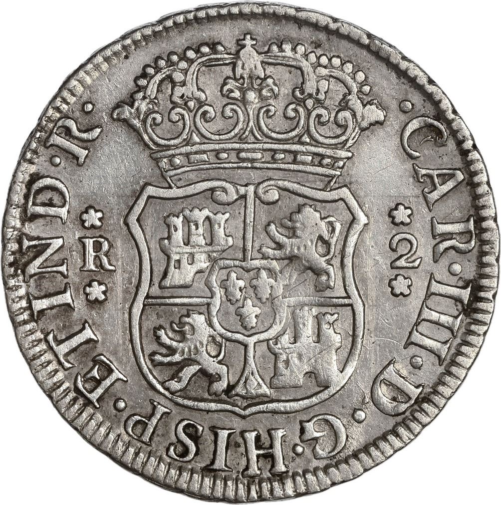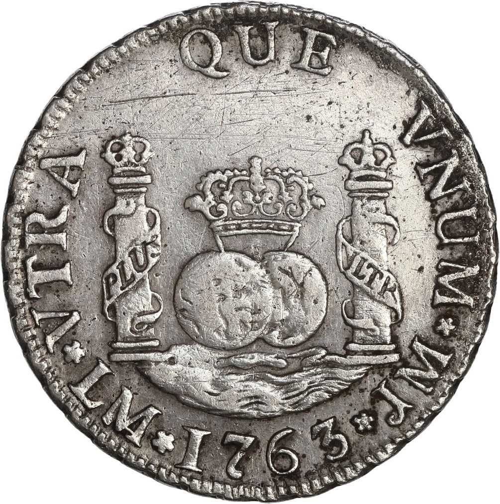 PERU, Lima, pillar 2 reales, Charles III, 1763 JM, mintmark with MA ligature, extremely rare, ex-O'Brien, ex-Fleming. Yonaka-L2.63; Cal-573; KM-62. 6.59 grams. Bold but harshly cleaned XF+ with old scratches, toning in letters, rated R4 in Yonaka with just one example observed that is not the same coin as this lot. Pedigreed to the John O'Brien Collection, with his tag, and to the Fleming Collection (Aureo & Calicó auction of November 2020, lot 1304).