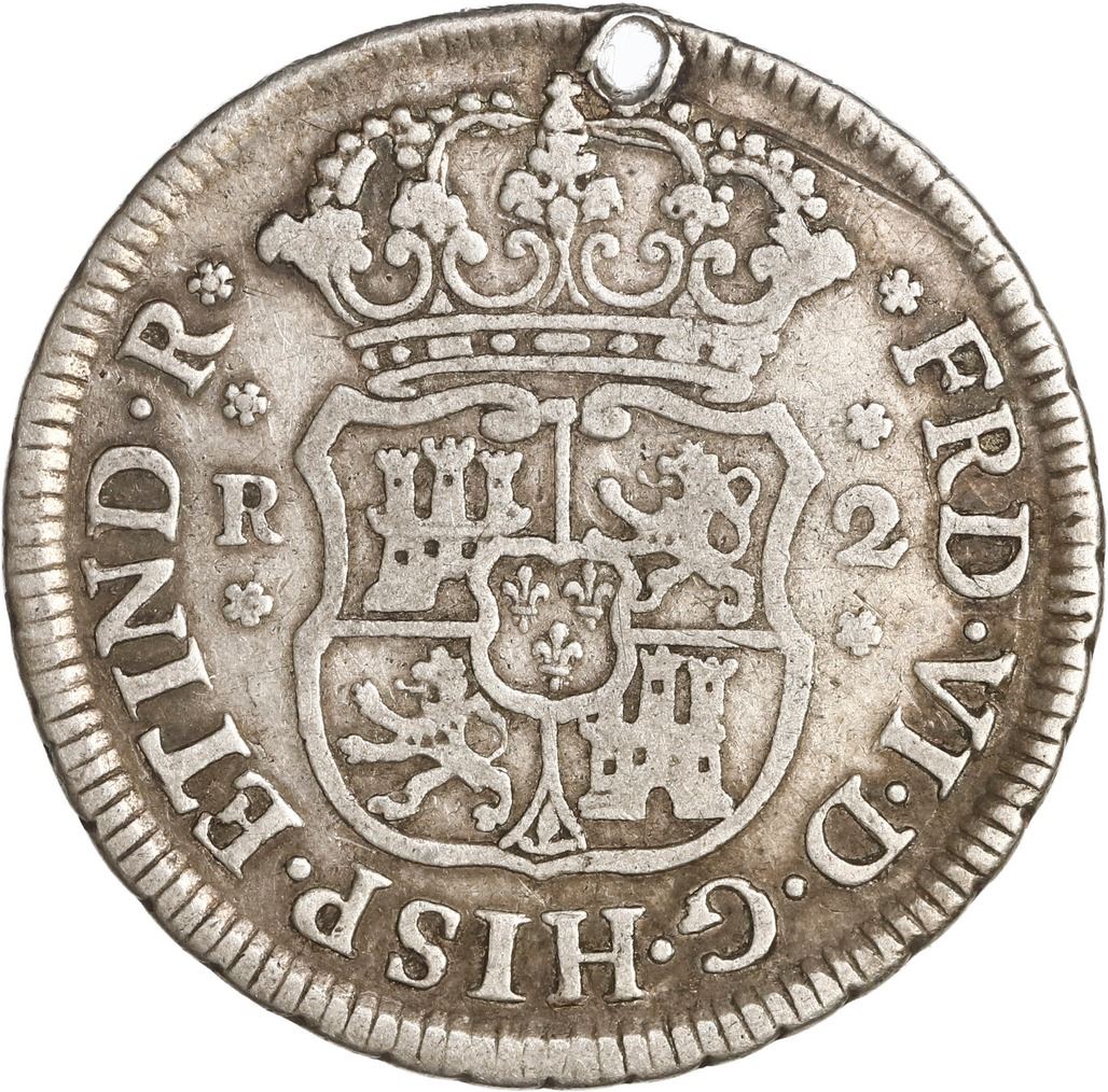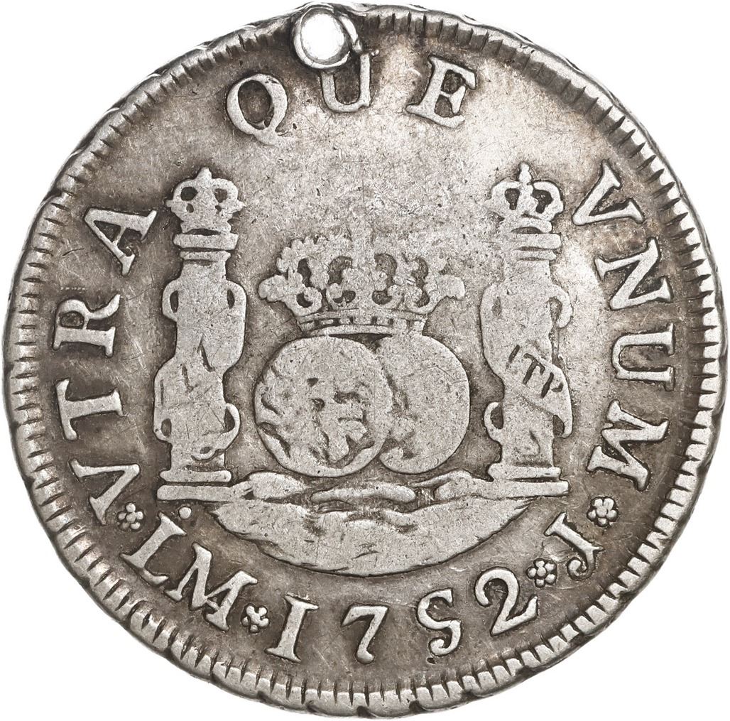 PERU, Lima, pillar 2 reales, Ferdinand VI, 1752 J, very rare, ex-O'Brien.