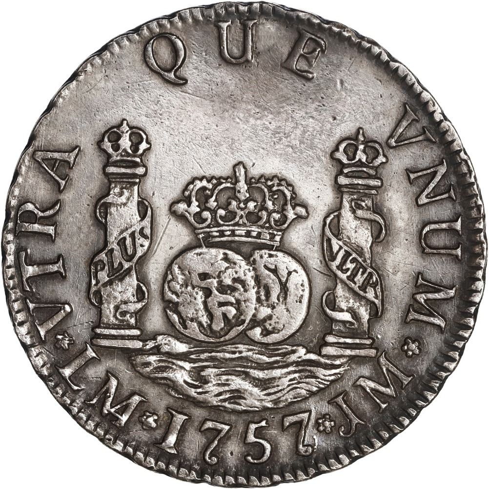 PERU, Lima, pillar 2 reales, Ferdinand VI, 1757 JM, ex-O'Brien. Yonaka-L2.57; Cal-275; KM-53. 6.75 grams. Very sharply detailed AU+ with deep toning over lustrous, cleaned surfaces, actually scarce without overdate (R in Yonaka). Pedigreed to the John O'Brien Collection, with his tag.
