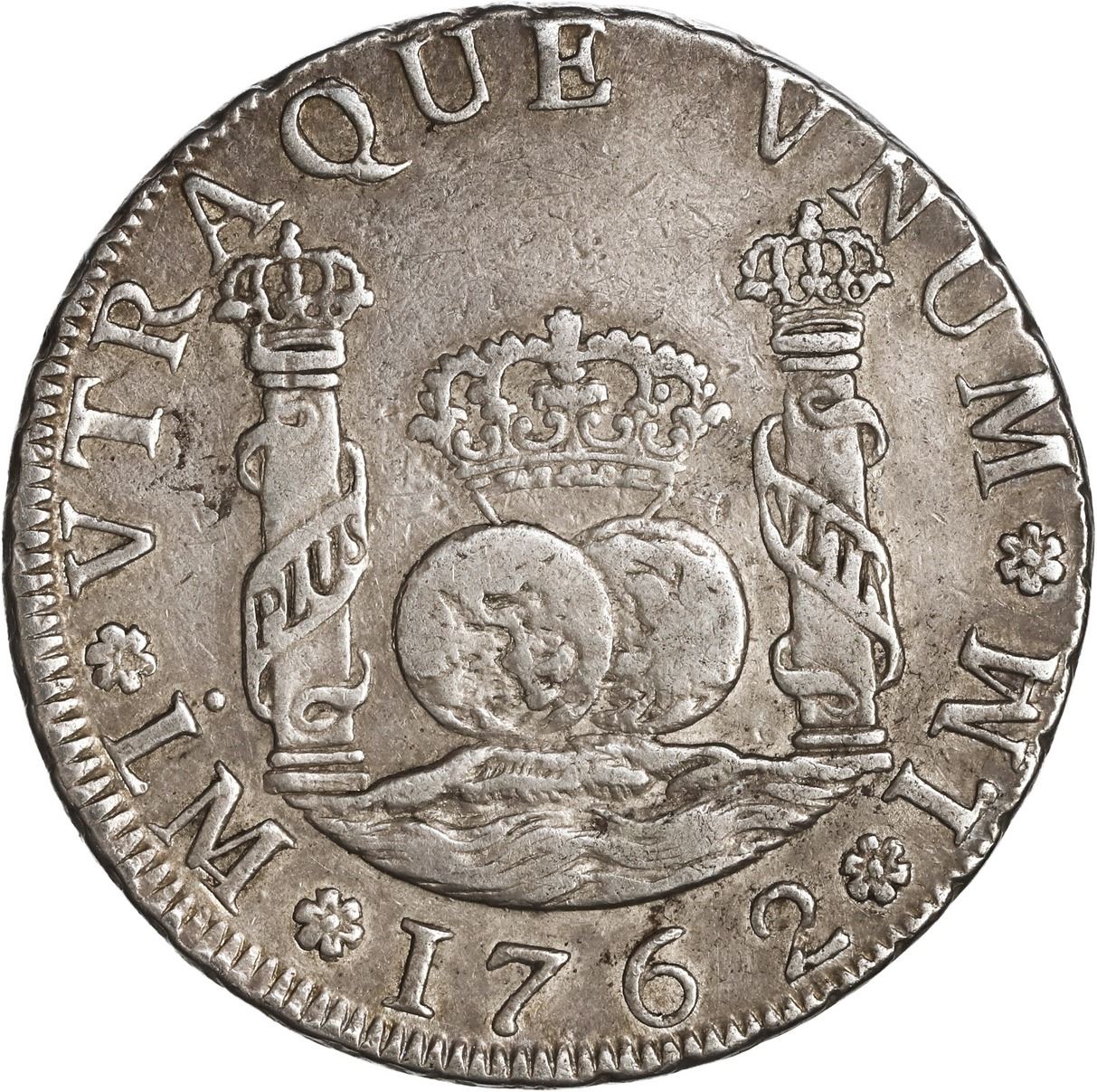 PERU, Lima, pillar 4 reales, Charles III, 1762 JM, very rare, ex-O'Brien, ex-Fleming. Yonaka-L4.62; Cal-819; KM-63. 13.32 grams. Low-contrast AXF (faintly toned) with no problems except for a very minor lamination flaw to left of left-hand pillar, rated R4 in Yonaka, but this coin not the single example observed and pictured in Yonaka (plus we have been able to trace at least four others). Pedigreed to the John O'Brien Collection, with his tag, and to the Fleming Collection (Aureo & Calicó auction of November 2020, lot 1467).