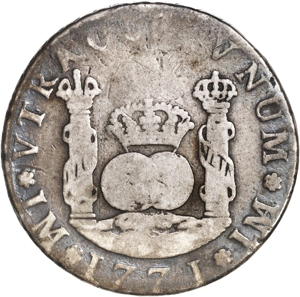 PERU, Lima, pillar 4 reales, Charles III, 1771 JM, neither mintmark dotted, very rare, ex-O'Brien, ex-Pat Johnson. Yonaka-L4.71a; Cal-829; KM-63. 12.83 grams. Richly toned About Fine with weak rims and very weak QUE in legend (symptomatic of this date) but clear mintmarks without dots, which Yonaka rates R3 (mintmark varieties not noted in Calicó or KM). Pedigreed to the John O'Brien Collection, with his tag, and to the Pat Johnson Collection.