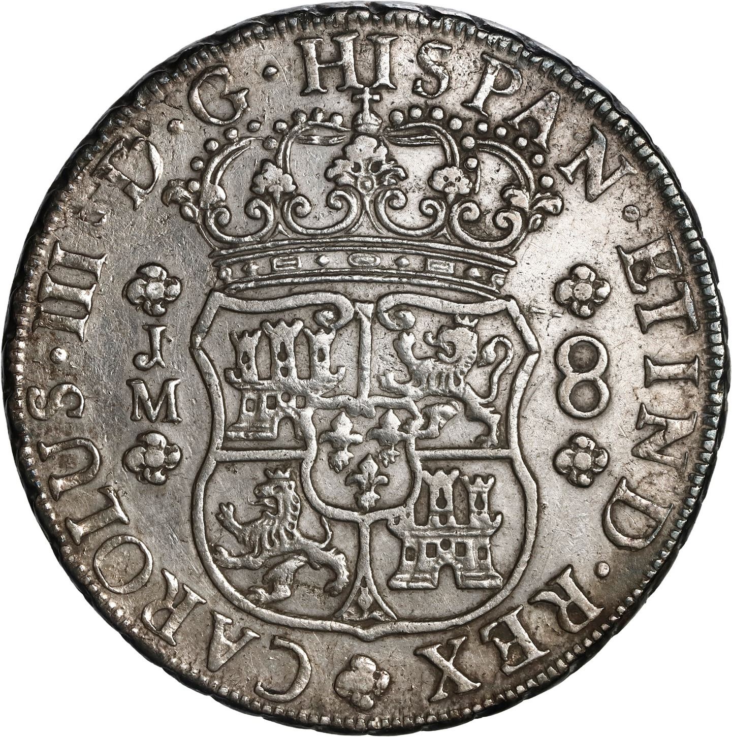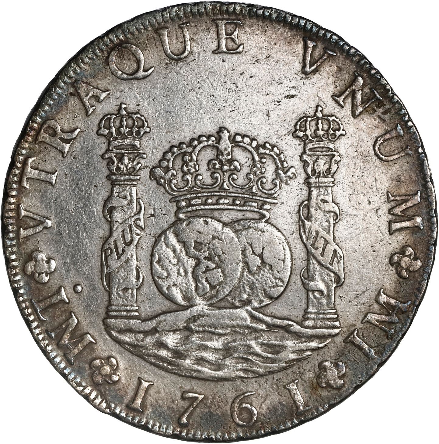 PERU, Lima, pillar 8 reales, Charles III, 1761 JM, no dot over right mintmark, ex-Brameld. Yonaka-L8.61; Cal-unl (cf. 1020); KM-A64.2. 26.70 grams. XF+ with light rainbow toning at rims, lustrous but lightly cleaned. (Note: Calicó does not differentiate the mintmark varieties for this type.). Pedigreed to the David Brameld Collection.