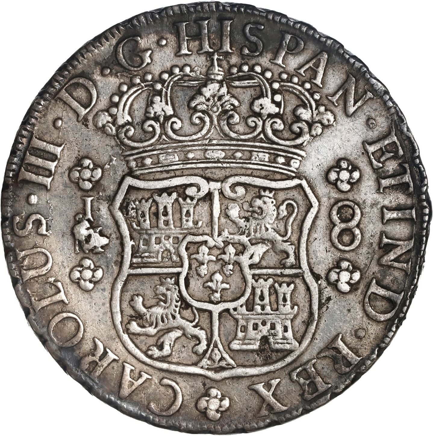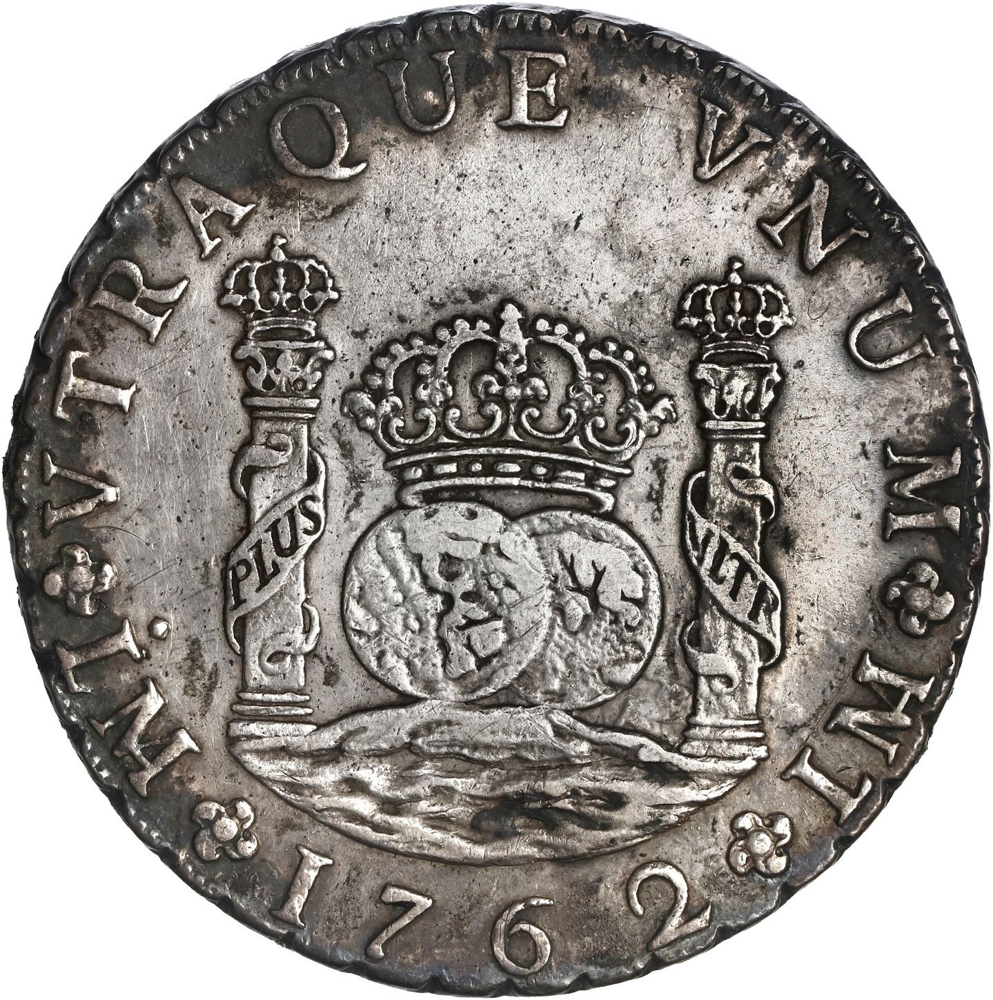 PERU, Lima, pillar 8 reales, Charles III, 1762 JM, no dot over right mintmark, ex-Brameld. Yonaka-L8.62; Cal-unl (cf. 1021); KM-A64.2. 27.10 grams. XF+ with spotty dark toning at rims, lustrous but lightly cleaned. (Note: Calicó does not differentiate the mintmark varieties for this type.). Pedigreed to the David Brameld Collection.