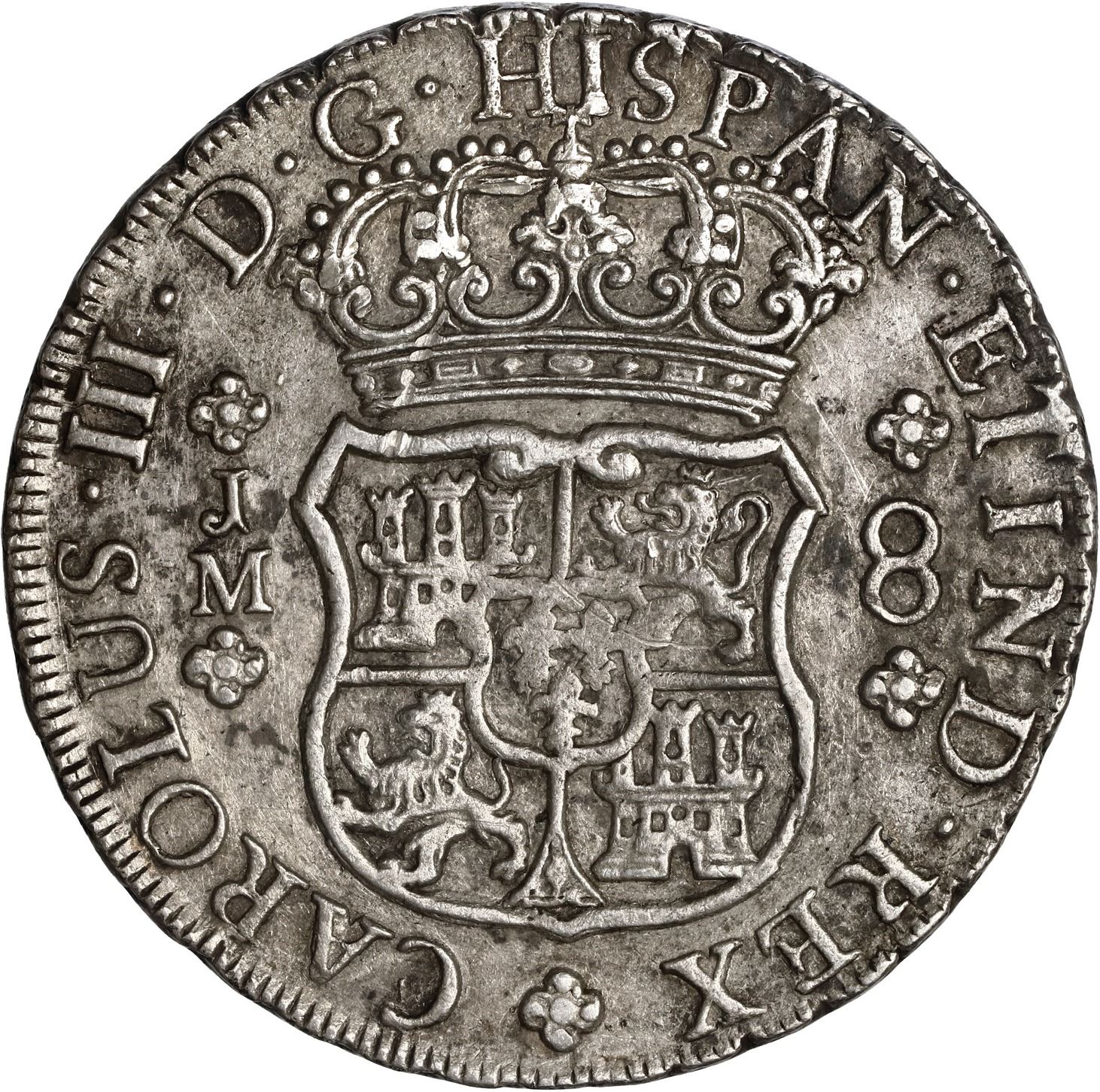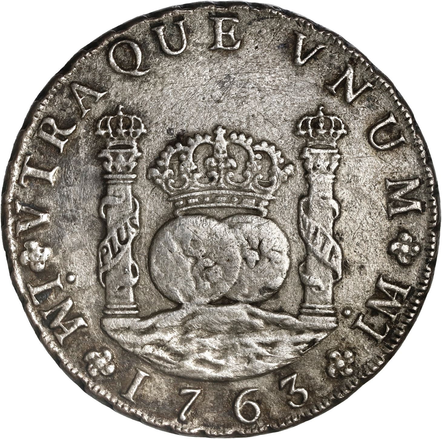 PERU, Lima, pillar 8 reales, Charles III, 1763 JM, ex-Brameld. Yonaka-L8.63a; Cal-1023; KM-A64.1. 26.59 grams. Bold XF with light toning on slightly oxidized surfaces. Pedigreed to the David Brameld Collection.