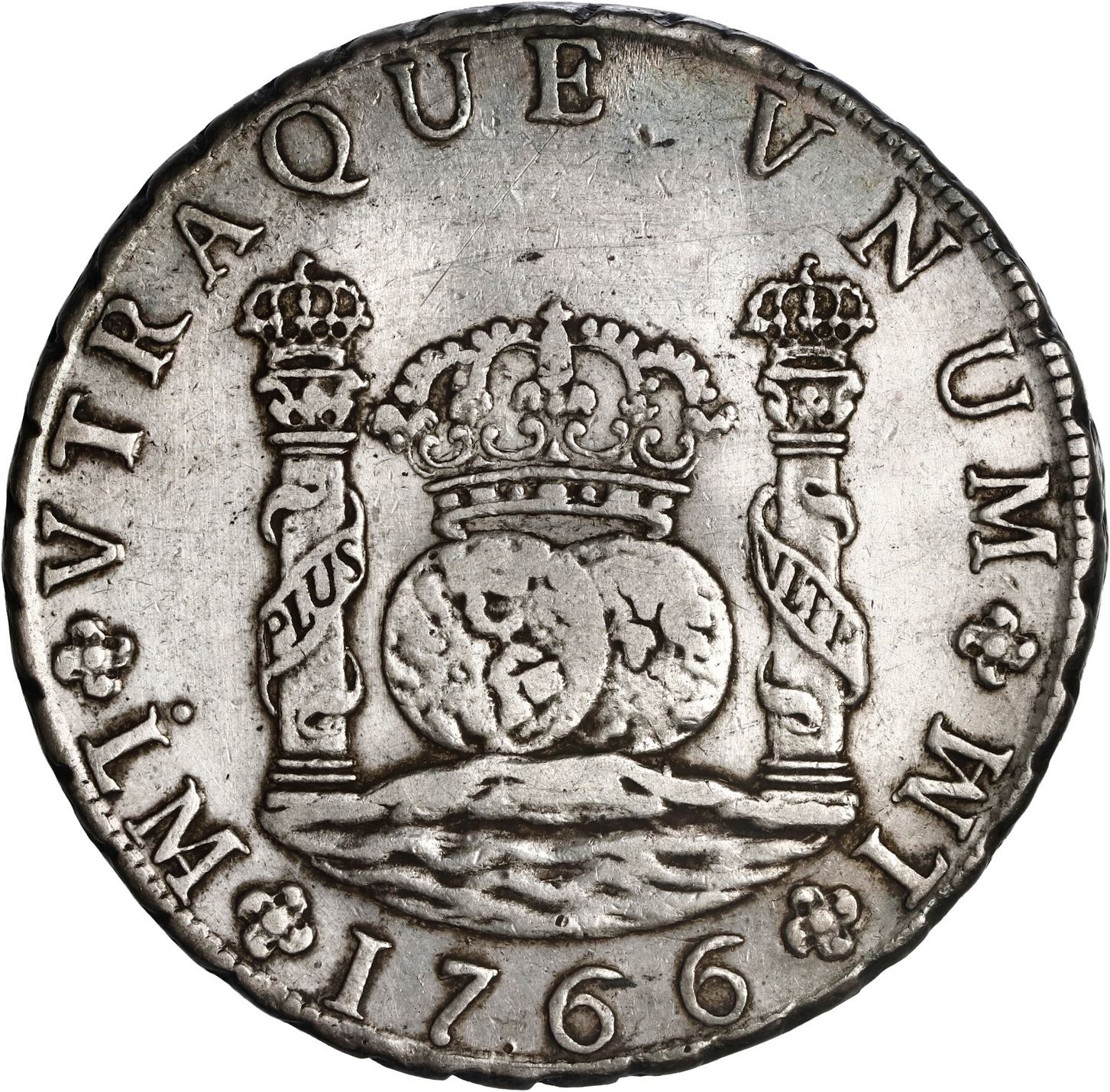 PERU, Lima, pillar 8 reales, Charles III, 1766 JM, no dot over right mintmark, ex-Brameld.