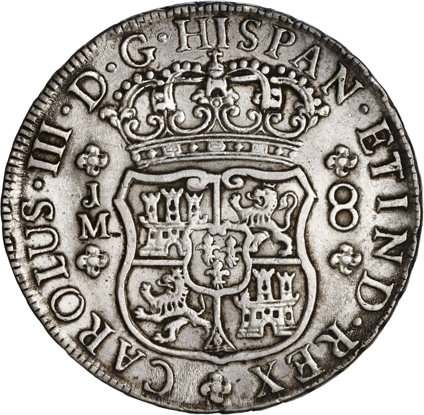 PERU, Lima, pillar 8 reales, Charles III, 1766 JM, no dot over right mintmark, ex-Brameld. Yonaka-L8.66; Cal-unl (cf 1026); KM-A64.2. 26.87 grams. Harshly cleaned XF with toning around details and traces of incipient rainbow toning at rims. (Note: Calicó does not differentiate the mintmark varieties for this type.). Pedigreed to the David Brameld Collection.