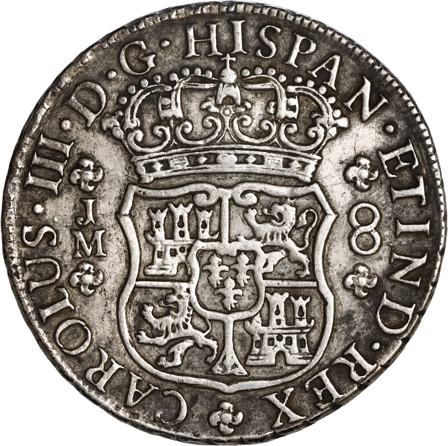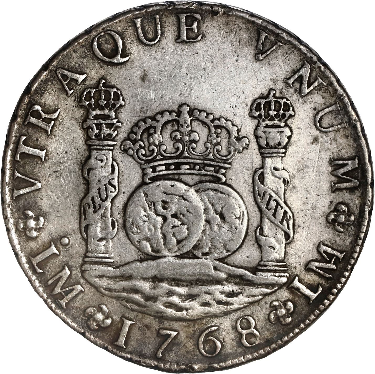 PERU, Lima, pillar 8 reales, Charles III, 1768 JM, no dot over right mintmark, ex-Brameld. Yonaka-L8.68; Cal-unl (cf 1028); KM-A64.2. 26.71 grams. Bold VF with toning around details, hairlined fields from cleaning. (Note: Calicó does not differentiate the mintmark varieties for this type.). Pedigreed to the David Brameld Collection.